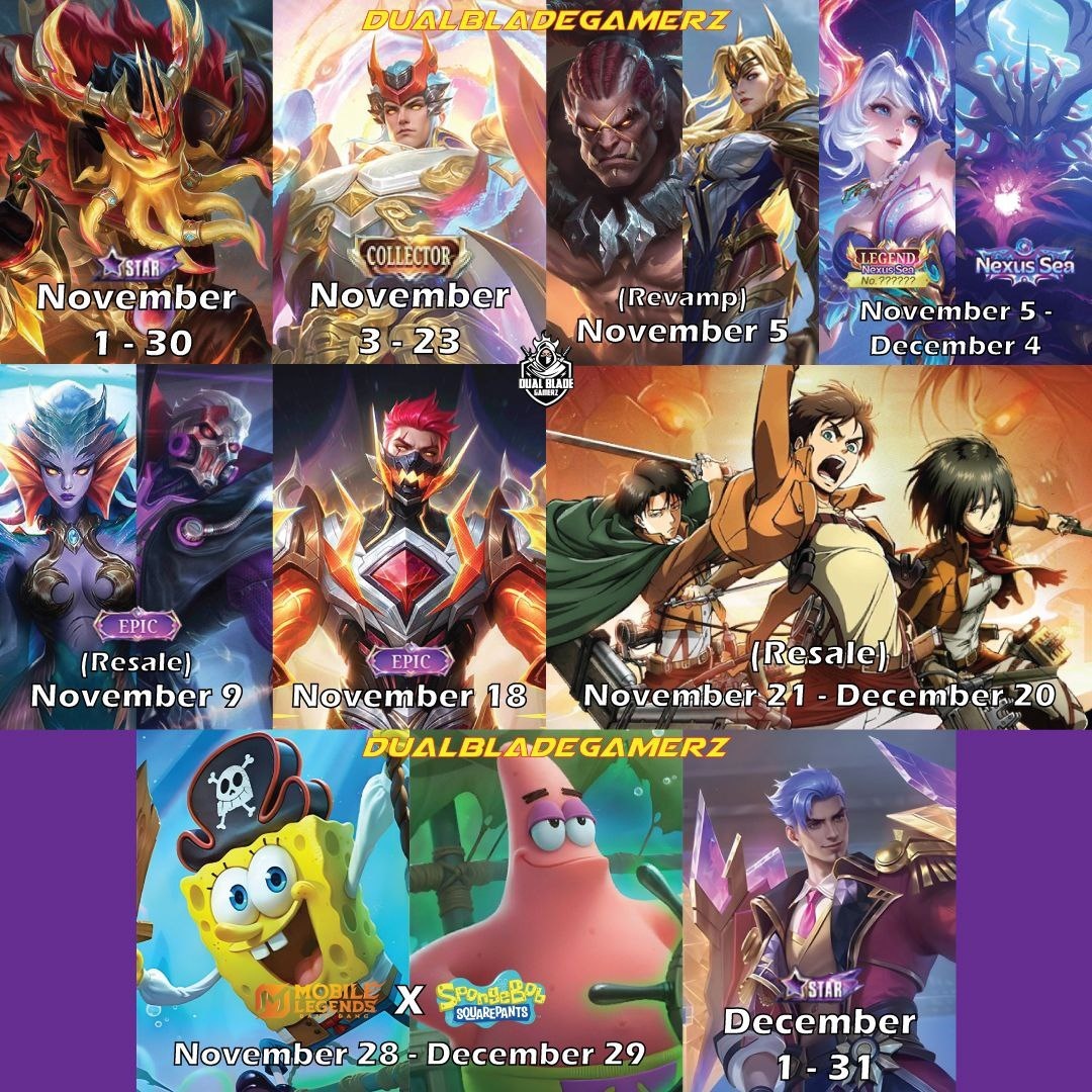 Дата выхода скинов за Ноябрь — Декабрь 🗓 1–30 ноября — Бэйн: Lord of Scalding Seas [Starlight] — 300💎 / 750💎 🗓 3–23 ноября — Тигрил: Celestial General [Collector] — ≈3000–6000💎 🗓 18 ноября — Пакито: Demontech Striker [Epic] — 629💎 / 899💎 🗓 21 ноября – 20 декабря — Коллаборация Attack on Titan (Yin – Eren, Фанни – Mikasa, Мартис – Levi) — 25💎–10000💎+ 🗓 28 ноября – 29 декабря — Коллаборация SpongeBob SquarePants • Циклоп: SpongeBob — бесплатно (за 2000 монет дружбы) • Глу: Patrick — 50💎–5000💎+ 🗓 1–31 декабря — Фредрин: Royal Marshal [Starlight] — 300💎 / 750💎 Выгодно и быстро пополнить алмазы Вы можете в нашем боте: @OneTwoPay_bot 🌟 Mobile Legends: Bang Bang