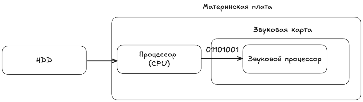 - Центральный процессор (CPU) передаёт упакованные цифровые данные (последовательность чисел) звуковой карте.