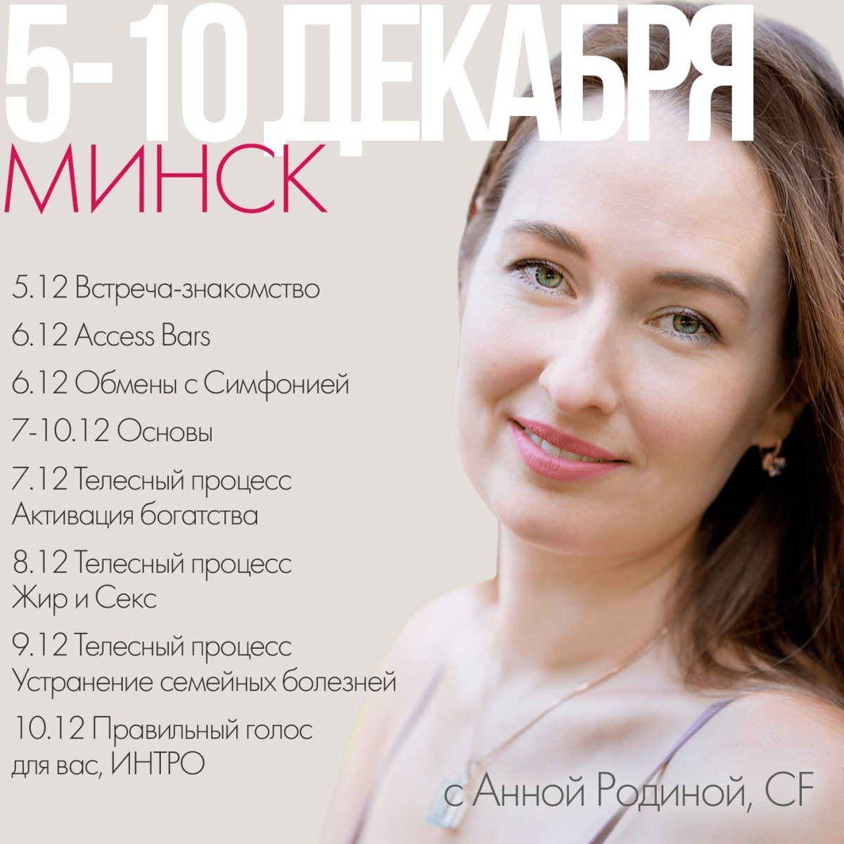В декабре собираюсь в Минск с классами и мне интересно, возможно, кто-то желает приехать и присоединиться, кому неудобно в Россию? Возможно, будет интересная информация для ваших знакомых? Расписание: 5 декабря 19:00 - встреча-знакомство с Access Bars ® 6 декабря с 10 до 18 - обучение Аксесс Барам 1080 BYN, повтор 540 BYN 19:00-21:30 - обмены с практиками Аксесс+ Симфония возможностей для всех участников 90 BYN 7-10 декабря - Основы с 10 до 16 ч, 6400 BYN, повторная цена 3200 BYN Вечерние классы: Телесные процессы: 7.12 - активация богатства 18:30-21:30, 220 BYN 8.12 - Жир и Секс 18:30-21:30, 220 BYN 9.12 - Устранение семейных болезней 18:30-21:30, 220 BYN 10.12 - Правильный голос для вас - вечерний класс 260 BYN Регистрация https://www.annarodina.com/minsk