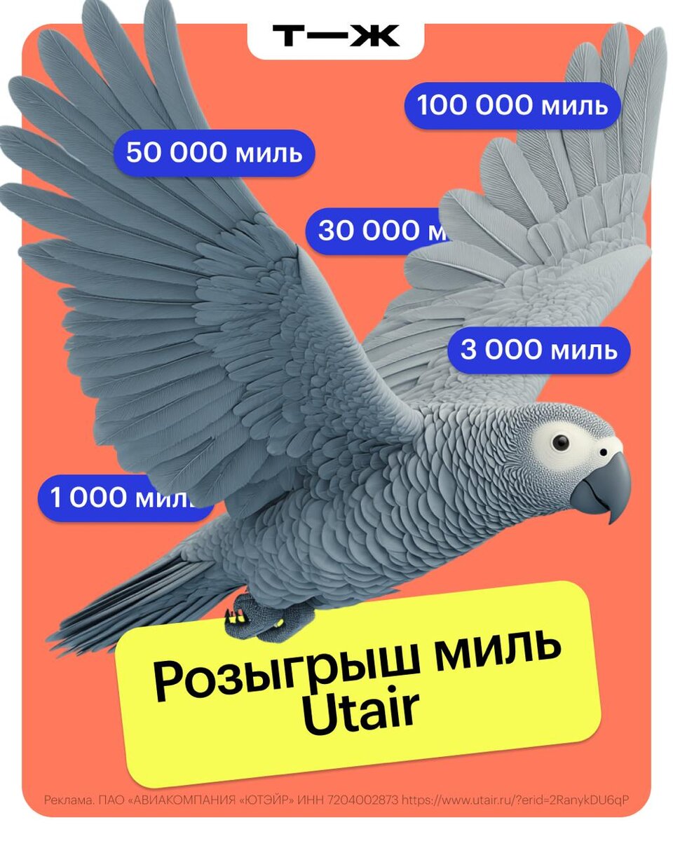 ✨ Подлетаем к зоне повышенного скопления миль У Utair большой розыгрыш: авиакомпания подарит путешественникам 400 000 миль за покупку билета через сервис «Т-Путешествия» картой Black Т-Банка. Забронировать рейс можно до 9 ноября, а срок вылета не ограничен! ✨ Трое самых везучих выиграют 100 000, 50 000 и 30 000 миль, а сто призеров получат по 3 000 или 1 000 миль — ими можно оплатить рейс или дополнительные услуги авиакомпании. Узнаем победителей 28 ноября, а сейчас вылетаем на охоту за милями по ссылке.
