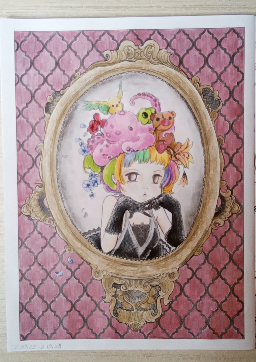 Всем чернично-космический привет! В предпоследние дни октября листаю с вами свои раскраски и показываю раскрашенные картинки. Как я говорила, в октябре крашу только мистические и хэллоуинские сюжеты. Как планировала, так и получилось. Несмотря на активное рисование Инктобера и своих собственных задумок, удалось раскрасить довольно много иллюстраций. Вначале покажу, что выполнила для марафона от Леопарды @Леопарда суровых штормов . Мне оставалось три темы, две из которых я с удовольствием закончила в этом месяце. Во-первых, был раскрашен женский портрет с многоцветными волосами. Нераскрашенных портретов девушек у меня огромное количество. Но для этой темы взялась за "Поп-мангу". Мне кажется, что цветные волосы подходят только аниме героиням. Не поленилась и выбрала девушку с игрушками и живностью на голове и с очень декорированным фоном. Во-вторых, покрасила музыкальный инструмент. Подобных вещей хоть отбавляй, в каждой книге найдутся разные инструменты в больших количествах. Однак