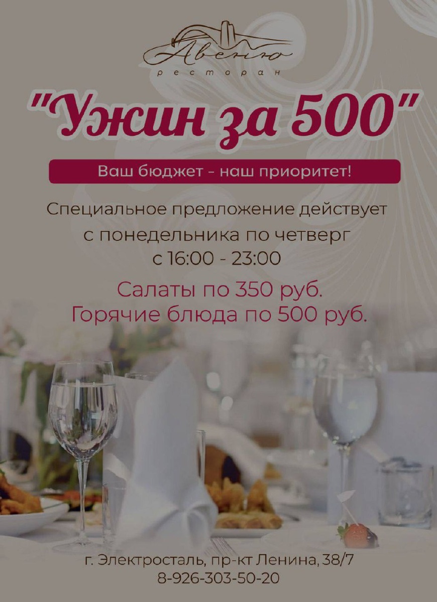 " УЖИН за 500 " Совсем скоро🔥 Такого в городе Электросталь ещё не было🔥 Ресторан " Авеню " подготовил для вас специальное предложение👇 🥩 Мясной пир всего за 500 рублей! Невероятно выгодное предложение для истинных ценителей мясных деликатесов. Побалуйте себя сочным, ароматным мясом, приготовленным по фирменным рецептам нашего шеф-повара. В вашем ужине: ⭐Сочное мясо высшего качества ⭐Фирменный гарнир на выбор ⭐Свежевыпеченный хлеб ⭐ Фирменный соус Специальное предложение действует с понедельника по четверг с 16:00 до 22:00 📞 Телефон для бронирования: 8926 303 50 20 ☎️ 📍 Адрес: г. Электросталь проспект Ленина дом 38/7
