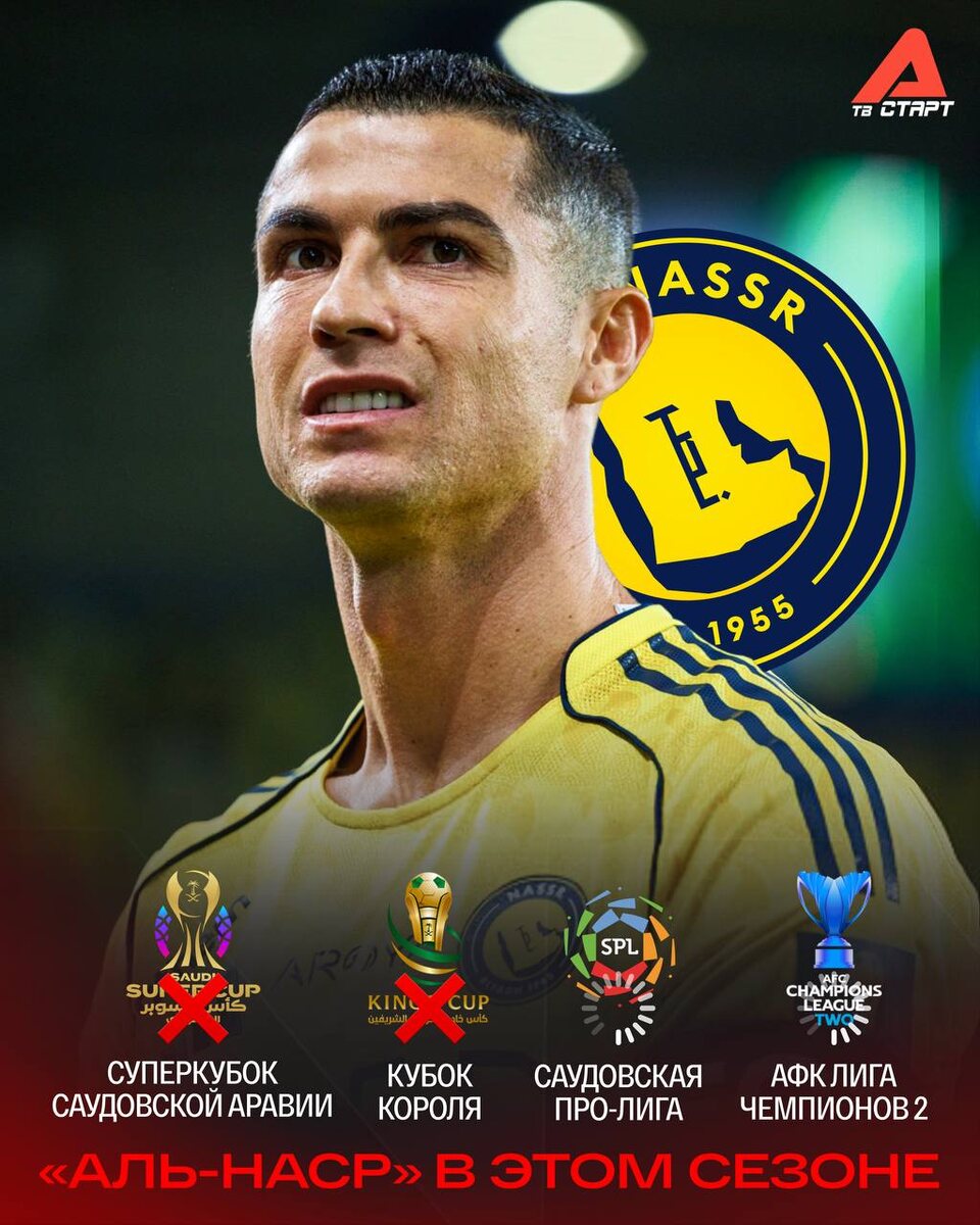 👀🫣2 года и 10 месяцев без трофеев на клубном уровне. Неужели Криштиану вновь ничего не выиграет с «Аль-Насром»? Осталось лишь два турнира в этом сезоне, в которых команда Роналду ещё принимает участие — Саудовская Про-Лига и АФК Лига Чемпионов 2🤔 Как считаете, сумеет ли Криш хоть где-то забрать трофей?🏆 Подписывайся на ТВ СТАРТ в MAX📲
