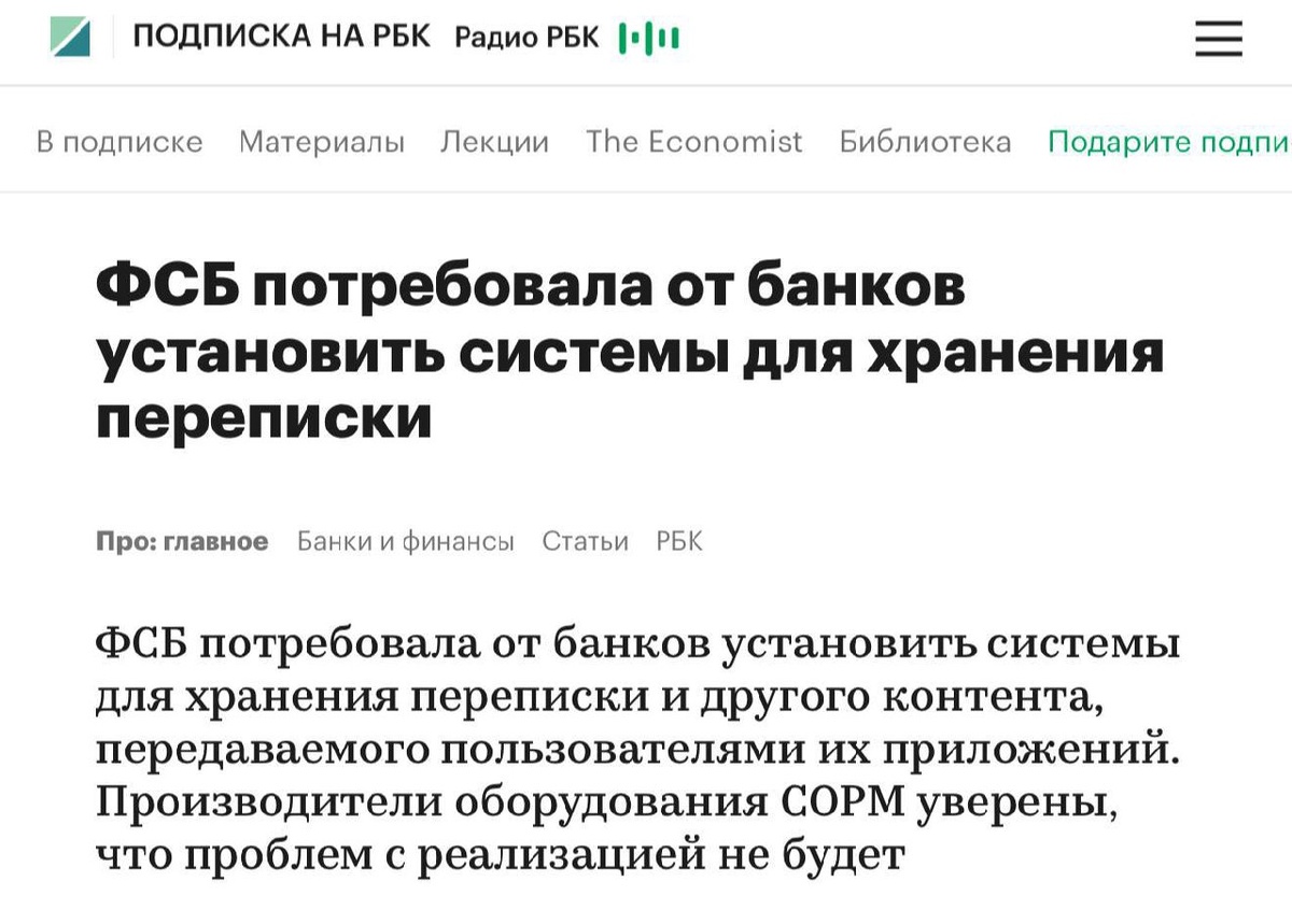 Привет, друзья! Сегодня поговорим о том, как изменится ваша цифровая переписка с 2027 года. По информации РБК, ФСБ планирует получать доступ к переписке россиян с банками. Для этого спецслужба потребовала от кредитных организаций установить системы оперативно-розыскных мероприятий (СОРМ) до 2027 года. Эти системы предназначены для хранения переписок, голосовых сообщений, видео и другого контента, который пользователи передают в мобильных приложениях. По версии ФСБ, банки относятся к организаторам распространения информации и обязаны предоставлять спецслужбе все эти данные. Это значит, что ваша личная информация, которую вы доверяете банкам, может стать доступной для государственных органов. Это может повлиять на ваше доверие к финансовым учреждениям и изменить привычки в использовании цифровых сервисов. Важно понимать, что такие изменения могут привести к снижению уровня конфиденциальности в цифровом пространстве. Мы все привыкли к мысли, что наши сообщения защищены, но реальность може