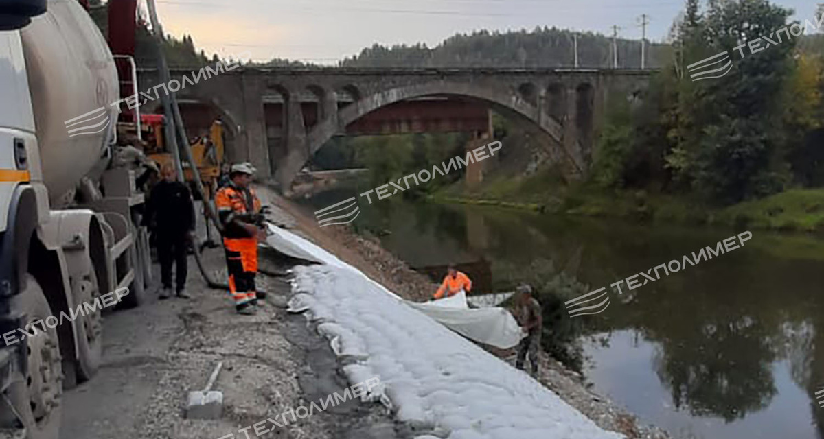 На участке капитального ремонта автодороги Аша – Кропачево существовал риск размыва подтопляемого откоса, прижимавшегося к реке. Требовалось укрепление береговой линии, которое обеспечило бы долговечность и устойчивость к паводкам, а также сохраняло эстетику природного ландшафта, известного как «Уральская Швейцария». Технология укрепления берега бетононаполняемыми матами