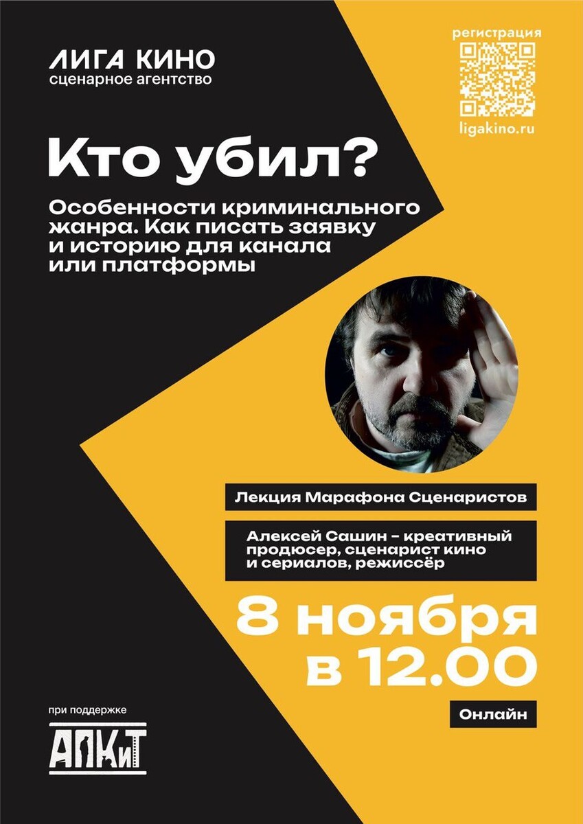 Первая бесплатная онлайн-лекция «Марафона сценаристов Лиги кино» под названием «Кто убил? Особенности криминального жанра. Как писать заявку и историю для канала или платформы» пройдет 8 ноября в 12:00. Об этом сообщает пресс-служба сценарного агентства «Лига кино». Лекцию прочитает Алексей Сашин, работавший редактором нескольких сезонов «Улиц разбитых фонарей», «Паутины», «Агента национальной безопасности», «Шерифа» и «Москвы. Трех вокзалов». На позиции креативного продюсера онлайн-платформы Premier он участвовал в сериалах «ЮЗЗЗ», «Саша против!», «Соцсети», «Салют, начальник!», «Подслушано в Рыбинске» и других. Марафон сценаристов — это учебно-производственная онлайн-программа сценарного агентства «Лига кино», объявленная 8 октября 2025 года и приуроченная к десятилетию агентства в 2026-м. Агентство дважды побеждало в Баттле киношкол при поддержке АПКиТ и реализовывало отраслевые программы с крупнейшими игроками рынка, включая «Марафон сценаристов Кинопоиск HD» и «Мастерскую семейног