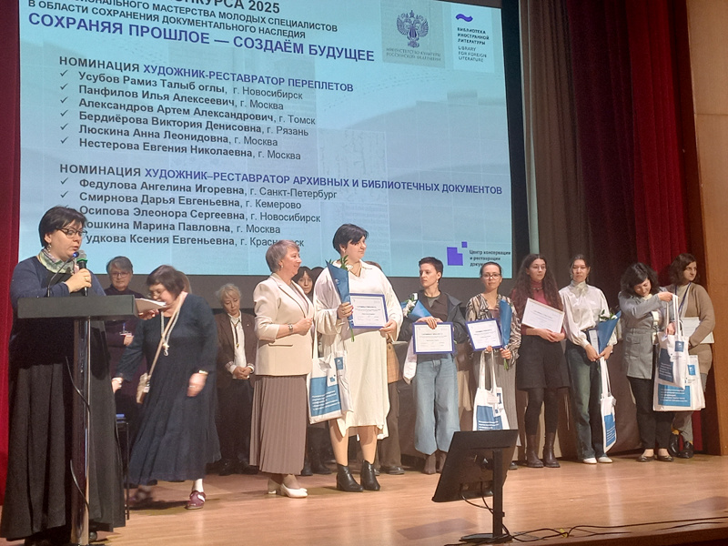 Сотрудники регионального центра консервации и реставрации приняли участие в IX Междисциплинарной научно-практической конференции «Книжные памятники в аспекте сохранности», организованной Всероссийской государственной библиотекой иностранной литературы имени М.И. Рудомино. В рамках конференции состоялся заключительный этап IV Конкурса профессионального мастерства молодых специалистов в области сохранения документального наследия «Сохраняя прошлое – создаем будущее». Конкурс, проводимый с 2022 года, стал платформой для молодых специалистов, стремящихся к профессиональному росту и развитию своих навыков в важной области сохранения культурного наследия. Художники-реставраторы Рязанского регионального центра консервации и реставрации Виктория Бердиёрова и Ирина Ушакова приняли участие в конкурсе в номинациях «Художник-реставратор переплетов» и «Художник-реставратор архивных и библиотечных документов» соответственно. Конкурсанты выполнили полученные от организаторов конкурса задания и направ