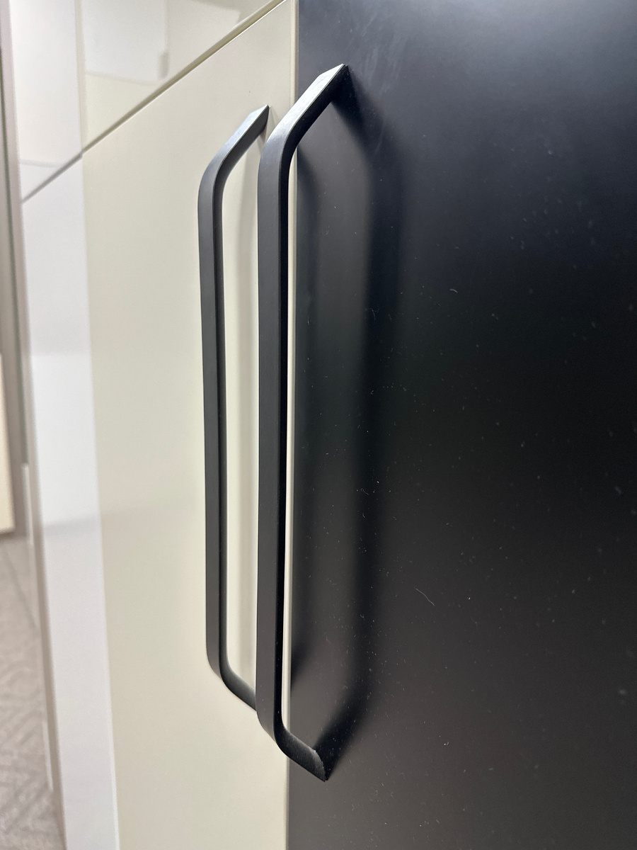 Во-вторых, определяющее значение имеет отделка металла. Полированная сталь придаст шкафу футуристический вид, матовый хром – современную сдержанность, а шлифованный алюминий – легкость и воздушность. Если металл покрашен в тон фасада, ручка практически сливается с ним, создавая эффект единой поверхности. А вот контраст может стать выразительным акцентом, особенно на фоне светлых фасадов.
