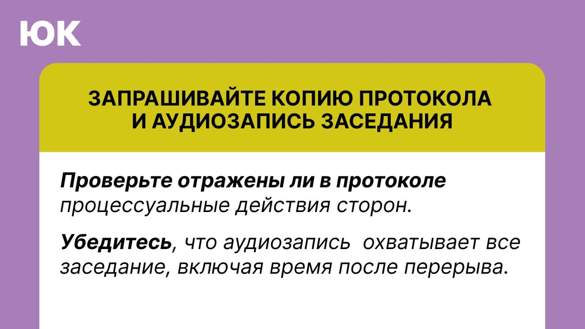 Из-за этих ошибок суда удается отменить судебный акт ➡️ Если аудиопротокола судебного заседания нет либо ввиду технических ошибок аудиозапись уничтожена/не воспроизводится — это весомый аргумент для суда, чтобы отменить судебный акт. Если аудиозапись заседания есть и доступна в КАД для воспроизведения, то даже при отсутствии подписи судьи в бумажном протоколе это нарушение не считается существенным и не влечет отмены судебного акта. ⚖️ Пример из практики: апелляция провела заседание с перерывом. В деле оказалось, что протокол после перерыва секретарь не подписал, на диске есть аудиозапись только первой части заседания, а записи заседания после перерыва нет. При этом в самом протоколе содержались противоречия: одновременно указывалось, что стороны не явились, и что они участвовали в прениях. Отметки, что запись не велась после перерыва в протоколе также не было. В итоге проверить, кто именно присутствовал и как проходило заседание, оказалось невозможным. Кассация отменила решение а