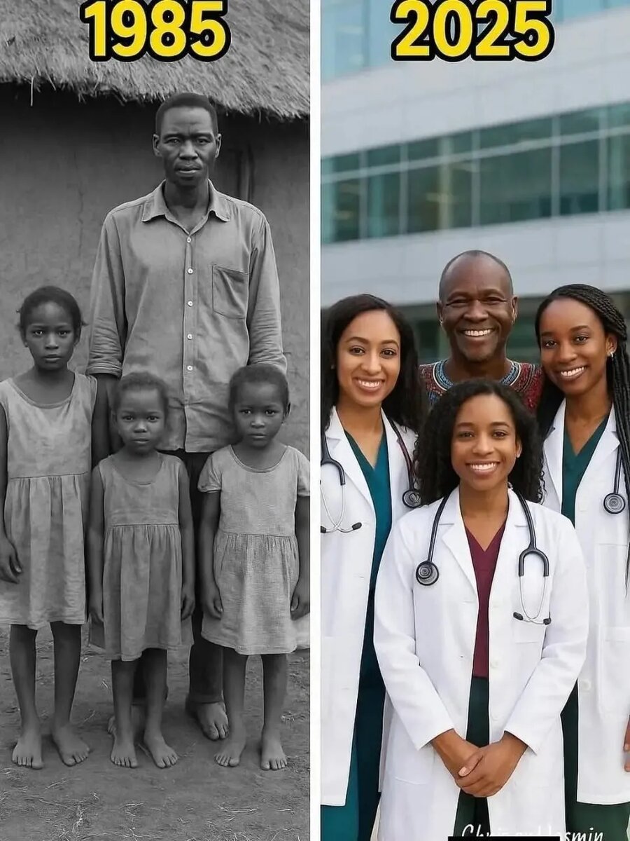 Фотография слева была сделана в 1985 году в простой деревне в Восточной Африке. На ней изображен мужчина по имени Дэниел, стоящий босиком и держащий за руки трёх своих дочерей. Его жена умерла при родах годом ранее. Он так и не женился снова — у него не было на это ни времени, ни желания. Дэниел был фермером, строителем, отцом и мечтателем. В их доме часто не было электричества. Иногда ужин состоял только из варёных кореньев и воды. Но у них было одно, и Дэниел обеспечивал это несмотря ни на что: уважение и достоинство. Каждое утро, до восхода солнца, он будил дочерей и отводил их в школу, расстояние в две мили. Сам он не умел ни читать, ни писать, но каждый день сидел в тени у класса, чтобы дочери не возвращались домой одни. Иногда он сам голодал, чтобы купить им школьные принадлежности. Он продал обручальное кольцо, чтобы оплатить экзамены. Во время сбора урожая он работал на трёх работах и покупал подержанные учебники — во многих из них не хватало страниц. Люди смеялись. «Это же д