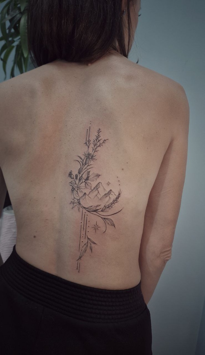 Впервые симметричный эскиз расположили сбоку спины и от этого он выглядит еще круче!! В каждой тату для вас есть смысл! В этой тату соединились сразу несколько глубоких символов. 🏔 Горы — устойчивость, опора, путь вверх. Они напоминают, что любая вершина покоряется шаг за шагом. 🌿 Чертополох — растение-защитник. Оно отталкивает всё лишнее и помогает человеку сохранить свою энергию, не позволяя никому её забирать. 🦗 Сверчок — голос души. Его тонкое пение слышно только в тишине — как интуицию, которую мы ощущаем, когда остаёмся наедине с собой. Написать мастеру http://t.me/alexandradulchy Тату.Смысл.Образ.