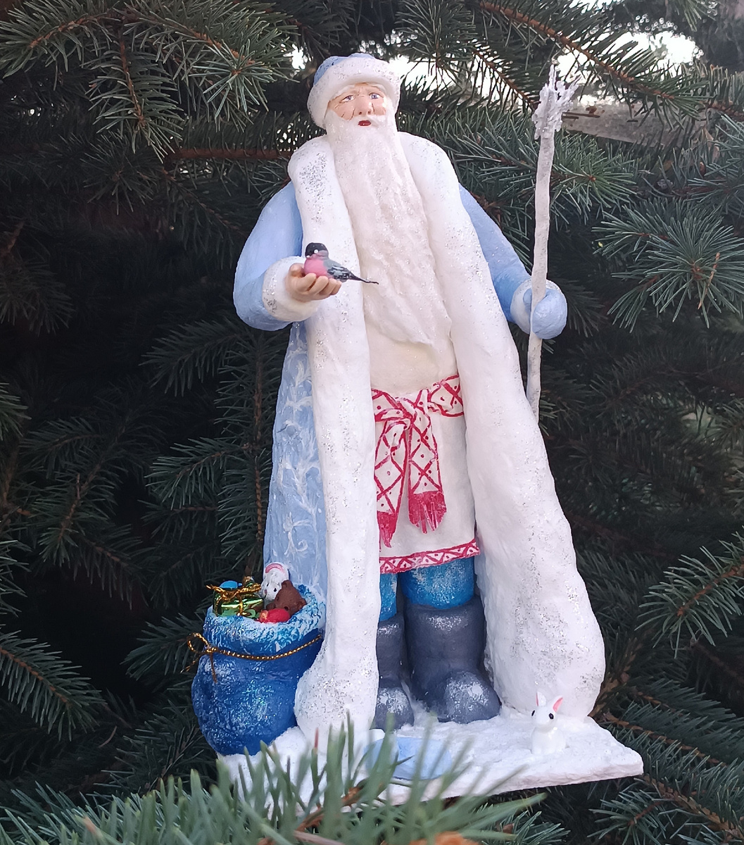 После того, как у игрушки выведены ноки и нижняя часть наряда, мне обычно работается легче и быстрее. Наверное, потому, что становятся понятными в реальности и пропорции, и сочетания цветов, и модель наряда. С Дедом Морозом работалось не так споро и скоро, ведь я впервые делала куклу такого размера. И каждый шаг, каждая новая деталь меня саму удивляли и вели за собой, порой даже в ту сторону, о которой я и не задумывалась изначально))). И шубка мне виделась иной, и прическа, а платформа-основа, на которой стоит Дед мороз, вообще рождалась на ходу. Однако, пока я ее не внесла в общую композицию, дальнейшая работа не могла быть продолжена, поскольку последующие детали игрушки должны были вырастать именно из этой основы. В качестве подставки я использовала обычный отрез фанеры. Он прямоугольный, что, признаюсь, не очень мне по душе. Гармоничнее бы смотрелось круглое основание. Но круга у меня не было, а Дед Мороз торопится с появлением. Значит, берем прямоугольник! На сухую поверхность я