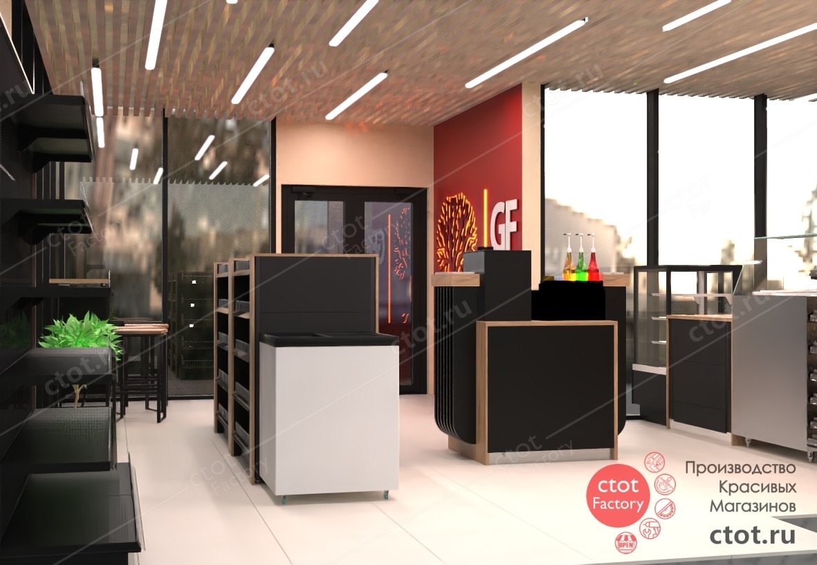 Современные путешественники ищут не только топливо для автомобиля, но и «третье место» для себя - пространство между домом и работой, где можно остановиться, вдохнуть и почувствовать атмосферу уюта. Эту идею сегодня подхватывают многие компании, создавая не просто торговые точки, а пространства для жизни. Именно в таком ключе фабрика Ctot Factory разработала оборудование для АЗС General Fueller, превратив её в стильный и удобный уголок, где хочется задержаться. Проект получился одновременно выразительным и функциональным: эффектная мебель сочетается с глубоким красным фоном стен. Дизайн работает как визуальный якорь, превращая стандартную зону обслуживания в стильное пространство, куда хочется вернуться. В проекте нашли отражение все элементы, необходимые для полноценного обслуживания гостей: удобная кассовая линия, островная конструкция и стеллажи, кофе-модуль, барный стол со стульями. Каждый предмет мебели выполнен в едином стиле с сочетанием тёплых текстур дерева и цвета черный граф