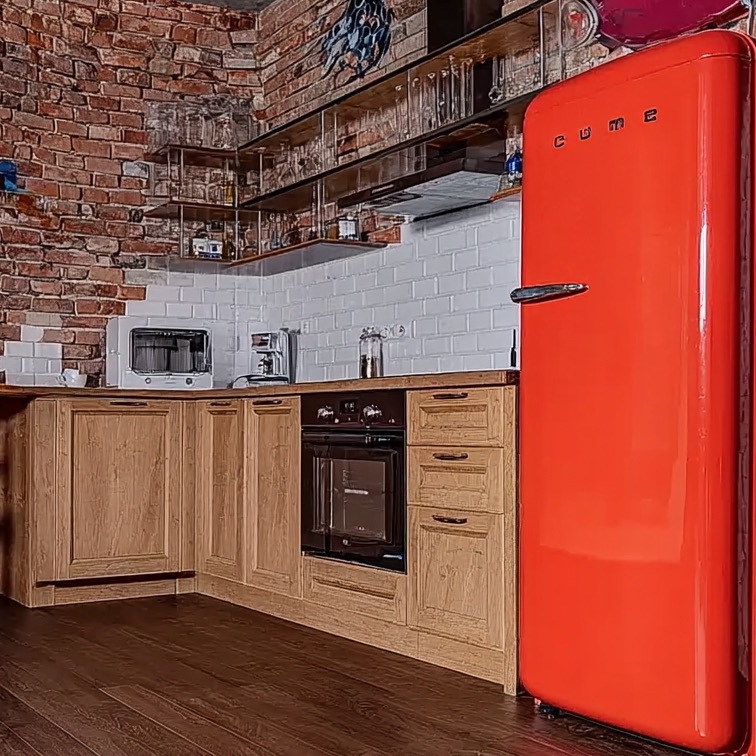 - Ретро‑холодильник в металлическом корпусе (например, пастельно‑зелёный или кремовый с хромированными деталями).