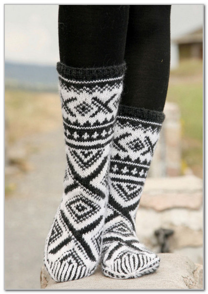 Эти носки-тапочки вяжутся от манжеты вниз круговыми рядами. Весь носок украшен узорами жаккарда, выполненными по схемам. При работе одним цветом оставляйте неиспользуемую нить внутри работы, следя за тем, чтобы не затягивать ее слишком сильно. Пряжа из чистой шерсти делает их идеальными для уютных домашних вечеров, проведенных у камина.