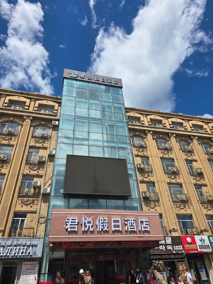 Обратная дорога из Даляня в Хуньчунь обошлась без особых приключений. И вот мы приезжаем в Хуньчунь. Последний день в Китае мы остановились в гостинице Цзюнь Юе ( 3 звезды), условия средненькие, но на завтрак шведский стол вполне приличный. Расположена она напротив известной гостиницы Туманган в квартале от торговой улицы. Возле гостиницы есть супермаркет, а на противоположной стороне улицы неплохой магазин сумок и аптека. Рядом хорошие кафе китайской кухни "Василиса" и "Ира Надя". Ужин на четверых в "Василисе" обошелся примерно в 160 юаней. Помимо традиционной китайской кухни, здесь вам подадут и русские блюда картофельное пюре и котлеты. Правда котлеты тут больше похожи на фастфудовские (уж очень зажаренные) и пюре отличается от оригинала, а цены на них выше чем на китайскую кухню, но дети к концу отпуска соскучились по русской еде и им было все равно. Самые выгодные покупки в Хуньчуне можно сделать в "Подземке" (подземном ТЦ под главной торговой улицей) и в социальном ТЦ Хуалон.