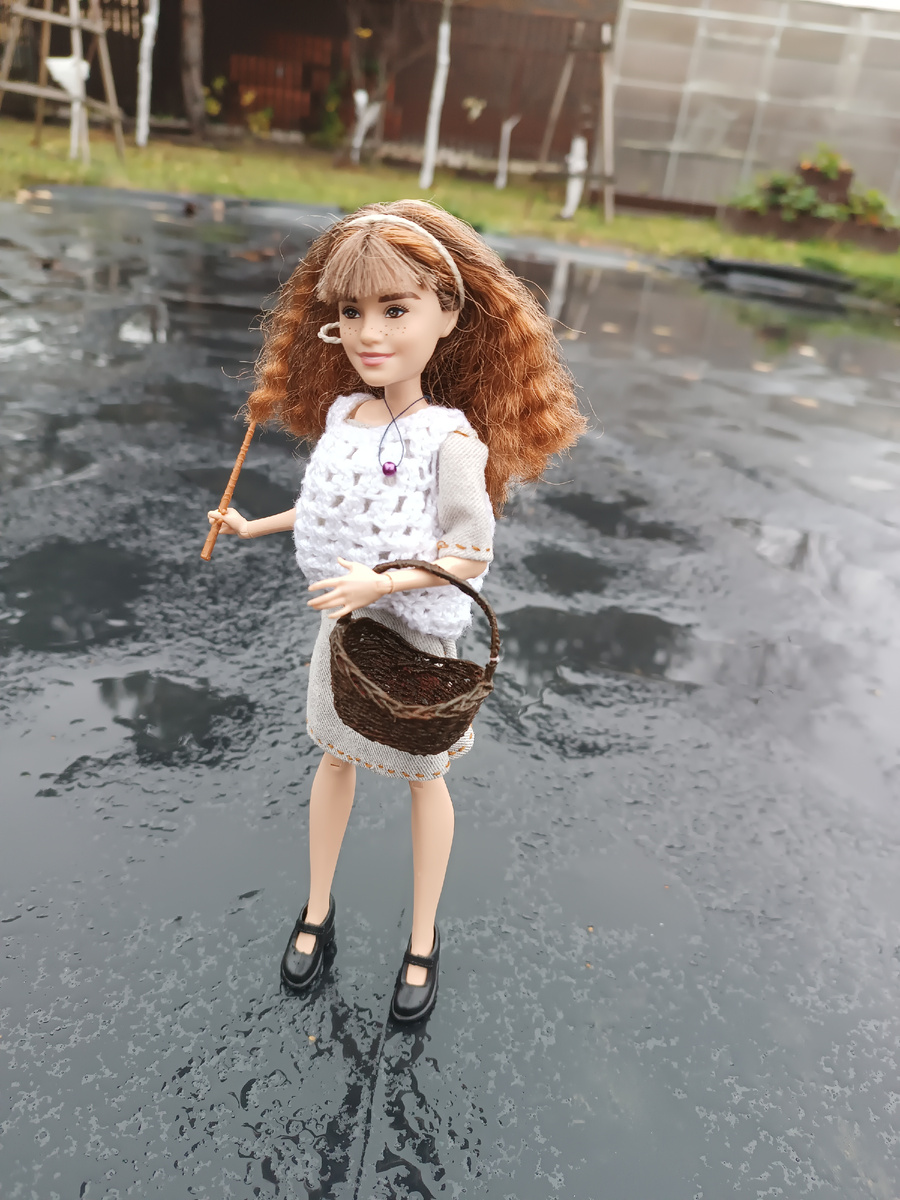 Всем добрый день. Гермиона решила отомстить Зое за все отнятые фотосессии. Мы даже подобрали образ - травница с корзинкой. Но всё пошло не так. Во первых у корзинки сломалась ручка. Я приклеила её на ПВА, так как суперклея не было под рукой. На улице он замёрз и стал крошиться. Во вторых дождь. Когда смотришь из окна его не видно. А когда я вышла то он появился. Моросящий и противный. В третьих Гермиона. Пока я фотографировала я начала видеть в ней кривизну. Глаза улетели на лоб, рот напечатан не по молду. В четвертых... Смотрите сами. Травница не получилась. Позади видно огород. Я редактировала как могла. Мне стало казаться что у Гермионы круглое лицо. И к тому же барбарис наскучил... Я перестала любить Гермиону. Мне не понравилась её одежда. У кого нибудь есть идеи что идёт этой девочке?
