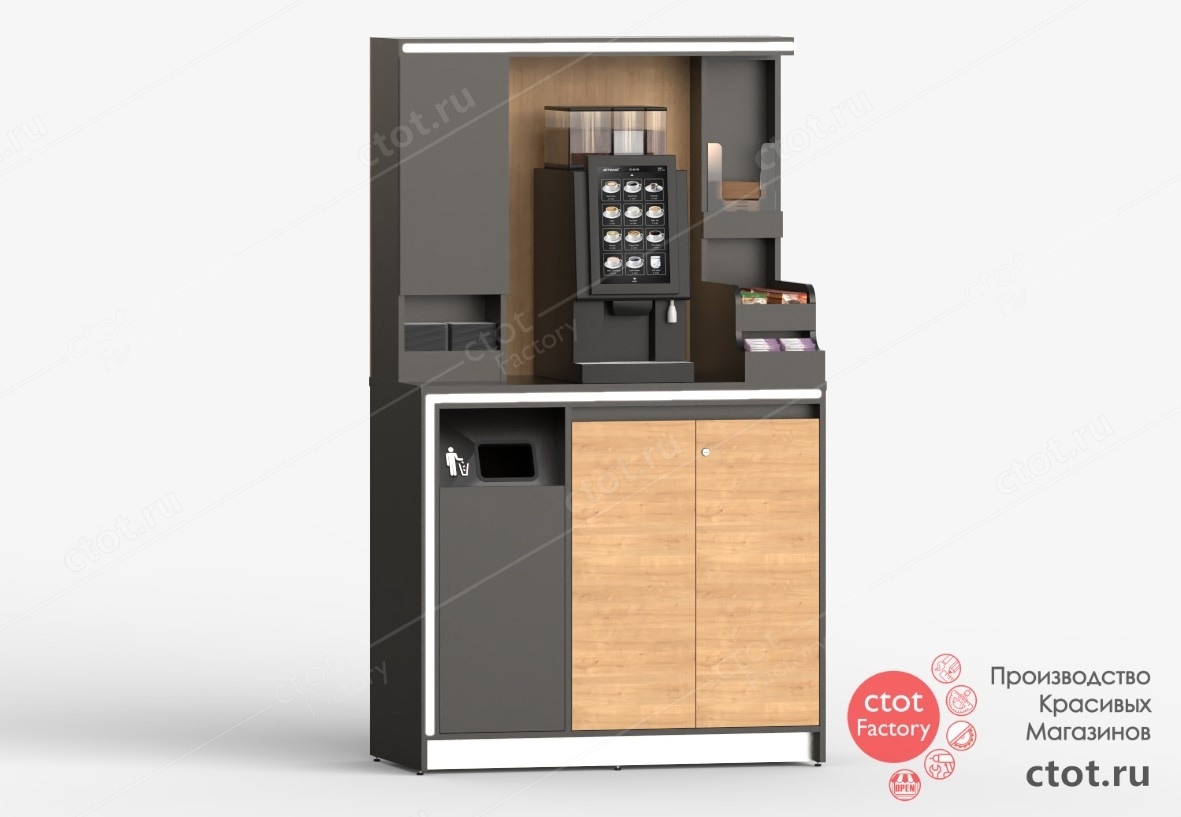 Гармоничное сочетание цвета, света и формы повышает вовлечённость и уровень доверия, а в корпоративной среде - напрямую влияет на восприятие бренда и комфорт сотрудников. Именно поэтому в Ctot Factory каждый новый проект начинается с продуманного дизайна! Кофейный корнер самообслуживания, созданный для офиса в Хабаровске - пример того, как эстетика и функциональность могут работать в тандеме. Эргономичная конструкция, лаконичные линии и приятные натуральные оттенки делают модуль уместным в современном офисном пространстве, а LED-подсветка подчёркивает его архитектуру и привлекает внимание. Отдельная отличительная особенность проекта - шкаф для кружек на замке, обеспечивающий порядок и персонализацию в корпоративной кофейной зоне. Модуль вошёл в основной каталог фабрики Ctot Factory. Как и все изделия, кофейный корнер можно адаптировать под индивидуальные запросы заказчика - изменить цвет, декоры, конфигурацию или добавить фирменное брендирование. 8420 Хотите узнать как мы можем помочь