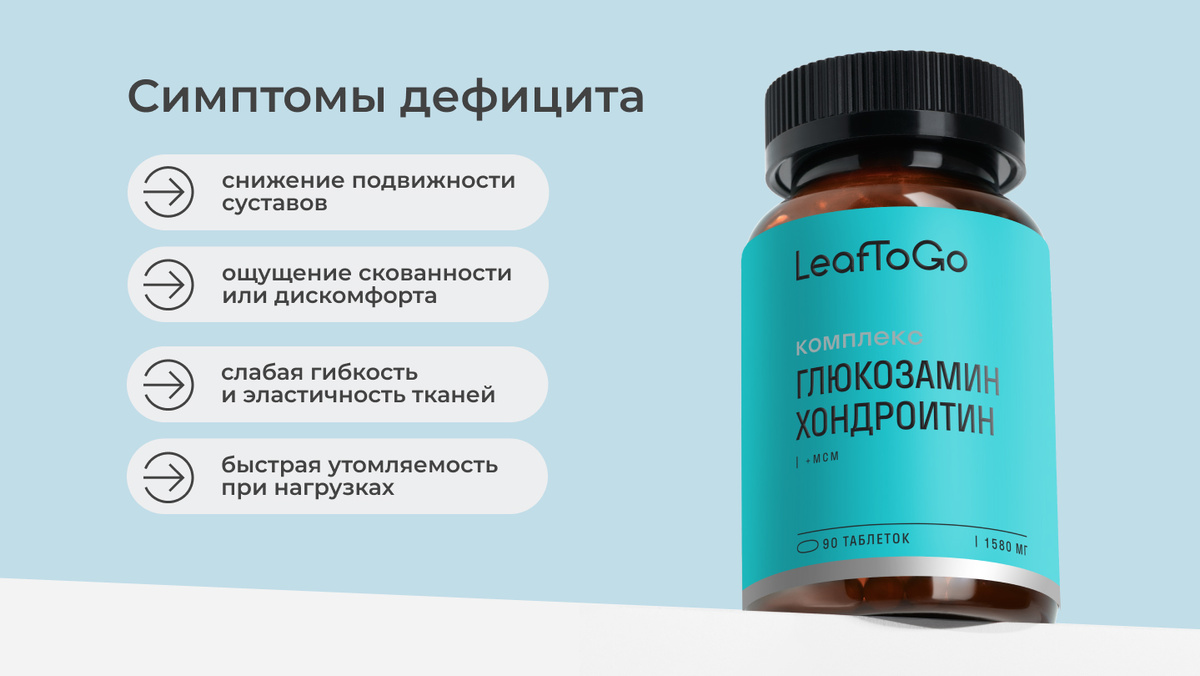 На полках аптек и маркетплейсов — десятки добавок «для суставов», среди которых часто можно встретить комбинацию глюкозамина, хондроитина и МСМ. Сегодня разберём, что известно о такой формуле, и чем интересен продукт «Глюкозамин Хондроитин + МСМ LeafToGo». В составе LeafToGo — три популярных компонента: Это не лекарства, а пищевые добавки — источники веществ, которые участвуют в обмене хрящевой и соединительной ткани.