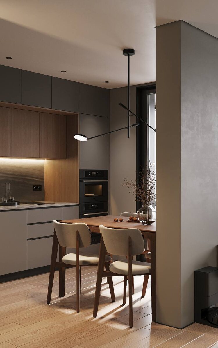 ВИЗУАЛИЗАЦИИ. Часть 1. Квартира холостяка в Царицыно 42м2. 🔹Компактная площадь, и небольшая высота потолка - 2,66м в черновой отделке! 🔹На данной площади необходимо было запроектировать много разных функций и запросов заказчика, а именно: спальное место, зона гостиной, обеденная зона, кухня, большая гардеробная, рабочее место, дополнительно, запроектировать кровать-трансформер, для освобождения пространства. 🔹Запрос заказчика реализовали, показываем вам первый вариант визуализаций. Как вам? 🤓