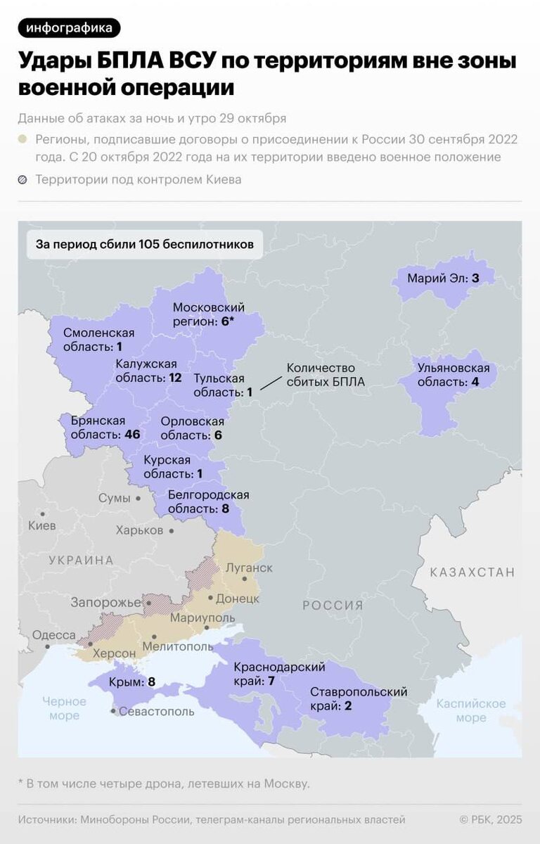 РБК публикует инфографику атаки украинских дронов на российские регионы, в том числе на Марий Эл, в ночь на 29 октября