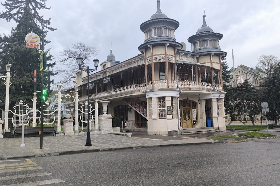 Рано утром, часов в 7 в Цветнике ещё никого нет, только на входе стоит грустный Киса. Никто его не обнимает, чтобы сфотографироваться, что днём почти не случается. Аллея под арками тоже пустая, нет ни центральной музыки, ни музыкантов-любителей.