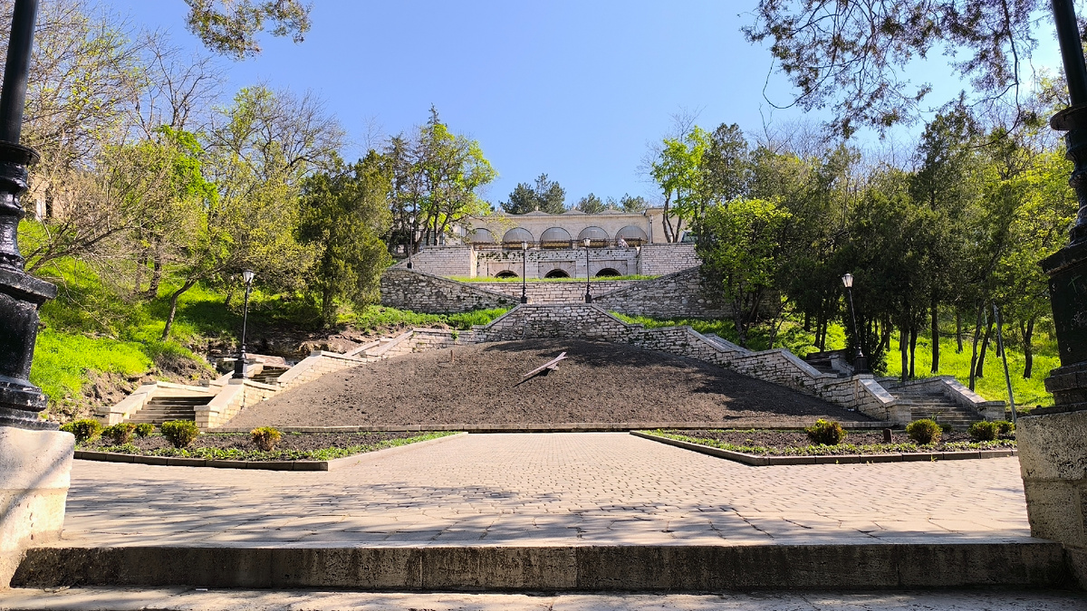Время пролетело стремительно, вот и утро последнего дня. Прекрасная погода, я уже собралась, Наташа спит. Есть время пробежаться до последнего места, куда я не успела ещё дойти, но очень хотела. Вверх по привычному маршруту до цветника, и дальше по проспекту Кирова до памятнику Пирогову. А от него - вниз по склону по тропинкам. Здесь на склоне разбросаны Бесстыжие ванны, дикие, минимально оборудованные источники, куда свободно может прийти каждый и принять ванну бесплатно. Но - в толпе, втискиваясь между другими такими же желающими. Поэтому я просто поснимала красоту воды, попыталась снять сами источники не снимая людей и пошла дальше вниз. Мимо пещеры, затем 2гис (снова) завёл меня куда попало, показав что интересующие меня следующие ванны находятся вон на том каменистом склоне. И только когда я туда залезла, 2гис исправился и показал их ниже и с другой стороны дороги. Зато по дороге под этой скалой находился вот такой мини-источник.