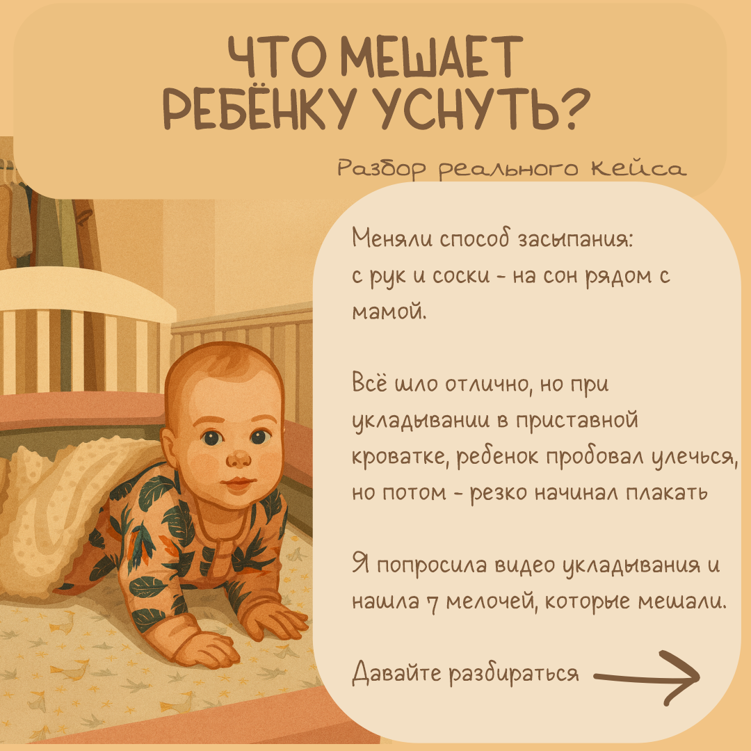 Недавно вела сопровождение семьи, где мы мягко меняли способ засыпания малыша: с рук и с соской ➡️ на засыпание рядом с мамой в приставной кроватке. После настройки режима и питания всё шло хорошо. Сначала мама убрала соску - и малыш уснул за 7 минут просто на руках, без укачивания! Я в шоке! ))) без соски Зашли, все сделали, был спокоен аж до закрытия ритуала. Это было 21:03. Начал хныкать, я попробовала взять его горизонтально, 21:05 успокоился в горизонтальном, но потом начал опять хныкать и выворачиваться в 21:07. Я снова его взяла вертикально, повыше на левое плечо, он уложил голову на плечо и в 21:10 уснул! Через пару дней начали практиковать засыпание в кроватке. И тут мы столкнулись с интересным моментом: в целом ребёнок был готов, пробовал улечься, немного похныкивал, но потом - резкая истерика и слёзы. Он явно МОГ уснуть сам, но что-то ему мешало. 📹 Я попросила видео с укладывания - и вот, что мы нашли. Эти детали часто незаметны, но они реально мешают ребёнку расслабиться