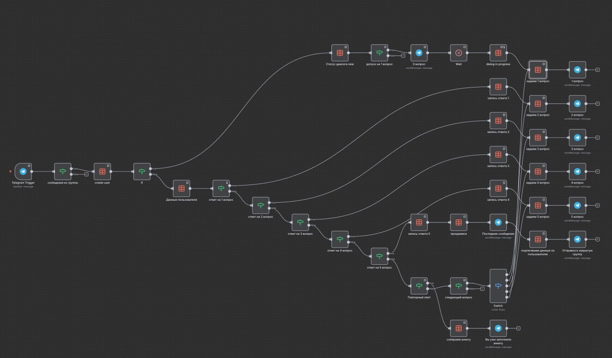 Если начать работать с n8n без дополнительного погружения, то на простую схему с 5 вопросами и записью ответов у вас уйдет