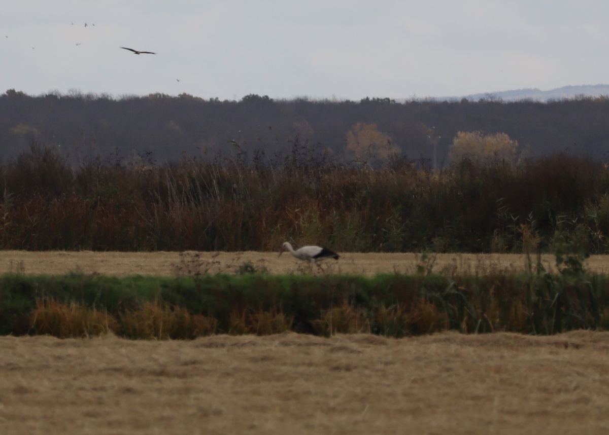 Приехав на место, где Аист был в последний раз, мы его не увидели. Расстроились. Как вдруг я различила белое пятнышко рядом с зарослями камыша! Он был там!!! Но не дороге, а чуть спустился к полю!