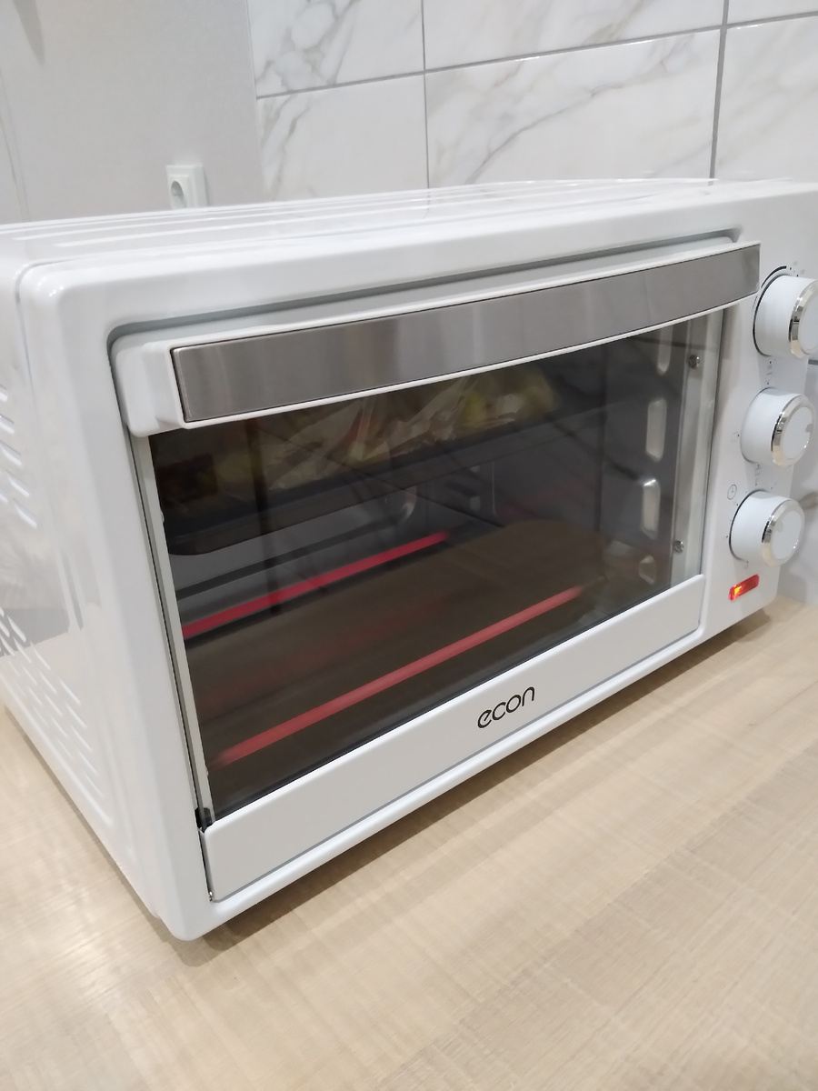 Есть у меня духовка. Большая. Чтобы ею пользоваться надо наклоняться, с у меня спина болит. Мыть ее сложно долго и нудно. Особенно уплотнительные резинки дверцы. Под духовкой полка для хранения сковород. Приходится и там постоянно мыть. Постепенно перестала пользоваться духовкой. А хочется себя и шарлоткой побаловать, и плюшками, и курником, и запеченной бужениной. И придумала я купить настольную электропечь. Как раз "черная пятница" на "Озон" подоспела. Выбрала себе печку по распродаже. Ориентировалась по отзывам. Почти все положительные. Продавец оперативно реагирует на замечания и претензии. Заказала и уже на следующий день она прибыла в пункт выдачи. Забирали с мужем. Коробка объемная, но легкая. Муж еще пошутил, что внутри ничего нет. А там электропечь, противень, решетка, ухват, инструкция. Вчера включили ее в первый раз. По инструкции на 15 минут. Хотела что-нибудь испечь. Не сложилось. Дома нет маленьких форм для выпечки. Все что есть в наличии для большой духовки. Надо сходить