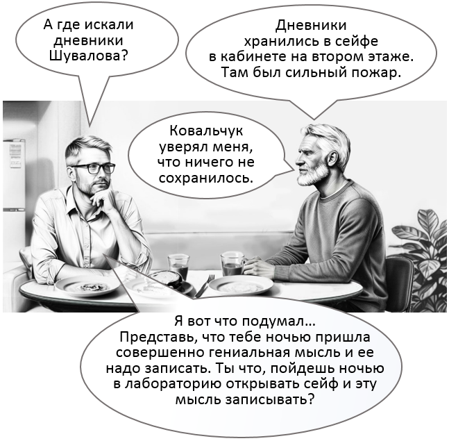 Ночью мне снился Шувалов. Я его никогда не видел, но был совершенно уверен, что это он. Мы с ним о чем-то беседовали, рассказывал он очень увлекательно… Я, к моему величайшему сожалению, ничего не запомнил, зато проснулся с очень интересной мыслью. Все эпизоды по этой ссылке За завтраком я принялся расспрашивать Павла. Павел задумался. Шувалов часто работал дома на веранде. Один или в компании с Ховриным. По правилам, он свои записи должен был хранить в защищенном месте. Значит у него дома тоже мог быть сейф! Вскоре приехали Люба с Димой и я изложил им свои соображения насчет сейфа. Диме идея понравилась. Мы оставили Павла вспоминать и ушли в гостиную. Любе не терпелось поехать в кафе, чтобы учиться дальше. Дима терзал свой смартфон, то и дело убегая в детскую, чтобы поговорить. А я очень хотел, чтобы Павел вспомнил что-нибудь важное, что даст нам зацепку, что позволит найти дневники… Очень хотелось верить, что они не погибли в пожаре после взрыва. Минут через двадцать Павел пришел к н