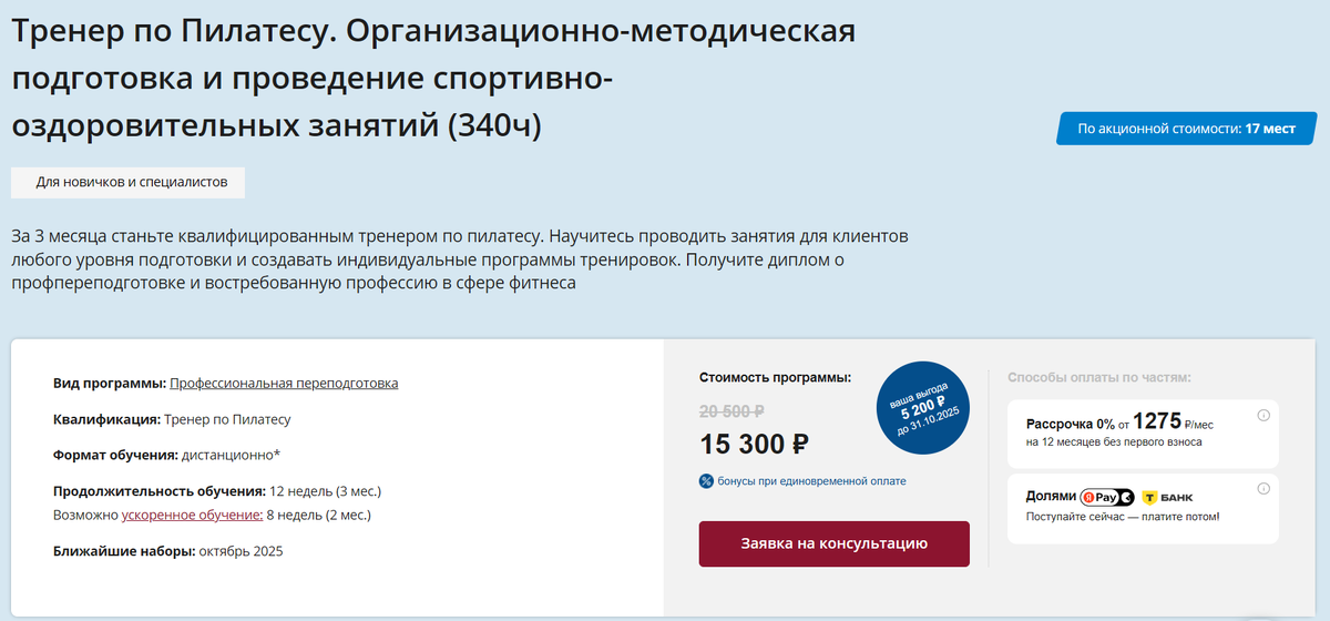 Курс «Инструктор по пилатесу» от НИИДПО — это программа профессиональной переподготовки для тренеров, инструкторов групповых направлений и всех, кто хочет получить новую профессию в фитнес-индустрии. Обучение охватывает классическую методику Пилатеса, анатомию, биомеханику и основы построения безопасных тренировок. По итогам курса слушатели получают диплом установленного образца, дающий право преподавания по направлению «Пилатес» в спортивных и оздоровительных учреждениях России.