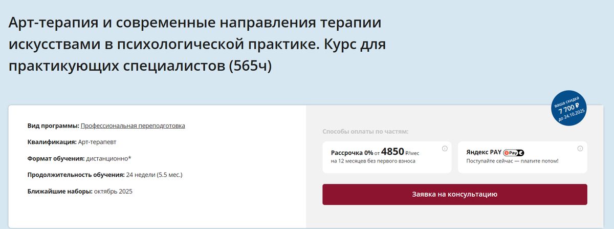 565 часов: введение; художественный практикум; базовые и инновационные техники; смежные направления (музыкотерапия, песочная, сказкотерапия); интермодальная интеграция; работа с детьми и подростками; профилактика выгорания и этика; практикум с супервизией; итоговая аттестация.