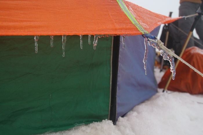 На первом привале я даже рюкзак не стал снимать - с ним было ощущение тепла. Ночью он отодвинулся от стенки шатра и снегодождем залило “за шиворот” - как раз в неприкрытую накидкой часть. Между мембраной и рюкзаком образовался слой неотбиваемой “глазури”.