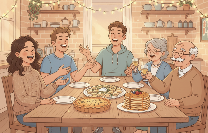 Когда наконец все блюда были готовы, стол выглядел как международный буфет: золотистый киш с ароматом сливок и сыра, стопка румяных панкейков, пахнущих ванилью, и моя тарелка с пельменями, которые выглядели почти как в рекламе (если смотреть издалека и при плохом освещении).