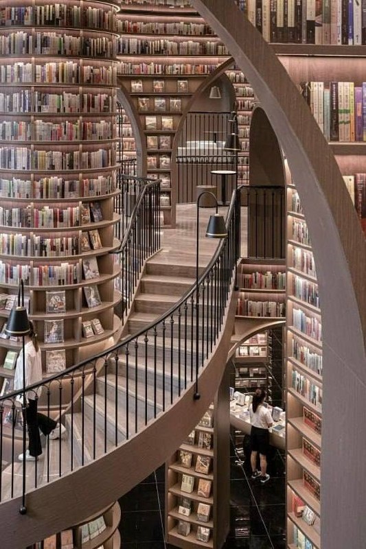 Самый футуристический книжный магазин в мире — «Чжуншугэ» в китайском городе Дуцзянъянь, неподалёку от Чэнду. В интерьере магазина активно используются зеркальные потолки и чёрные глянцевые полы, а визуальный эффект многократно усиливается — полки кажутся бесконечными из-за отражений. Верхние ряды книг — это не реальные тома, а плёнка с их изображением, что придаёт пространству сказочность, но реальный книжный фонд насчитывает более 80 000 экземпляров. Книжные полки также выделены световыми поясами, что подчёркивает каждую полку. Заглянули бы туда? ❤️