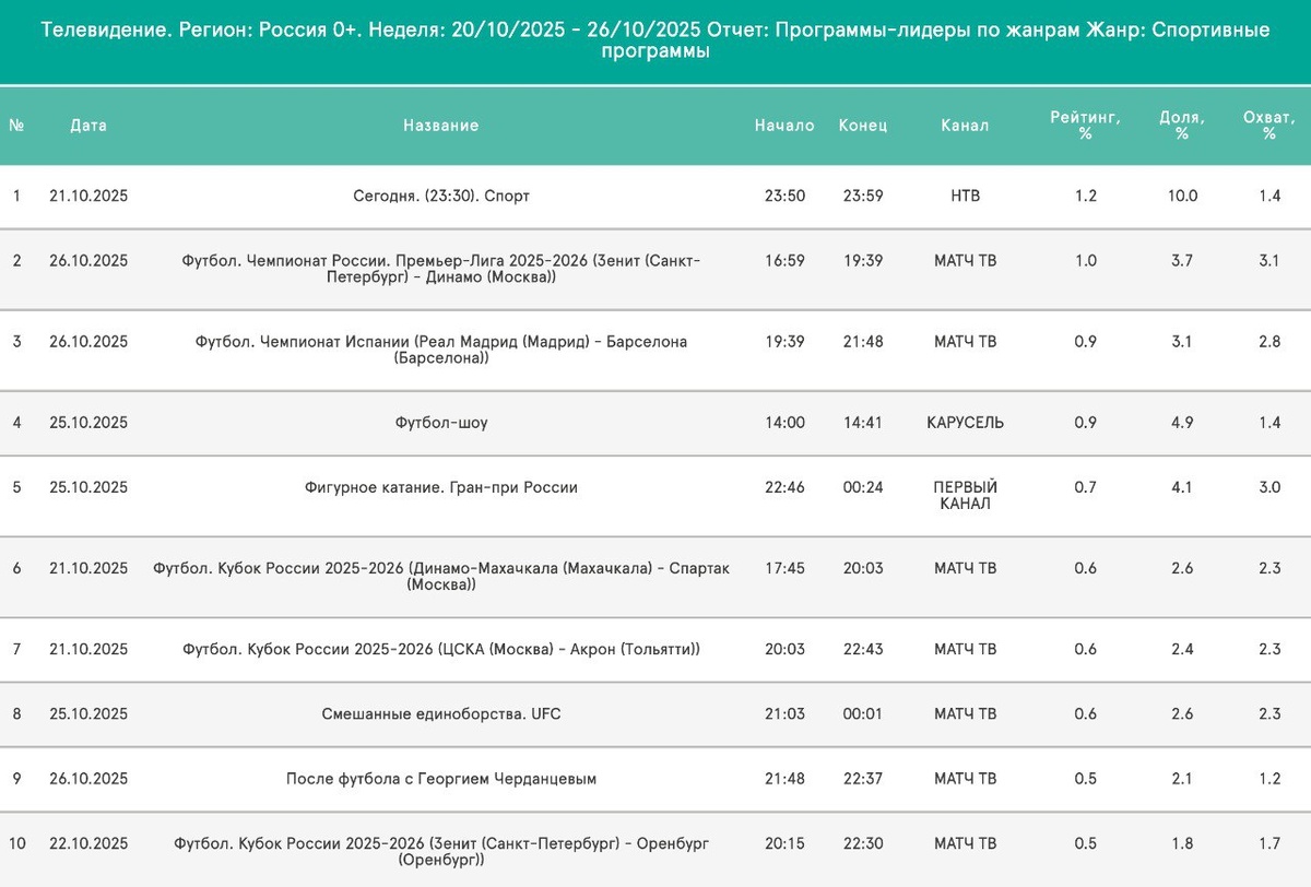 «ЧТО ПО ТЕЛИКУ»? Итоги спортивного смотрения 20.10-26.10, Россия, 4+ (137,4 млн чел.) 🗣 Ещё одна единичка рейтинга падает в копилку "Зенита". На этот раз это игра с "Динамо". Одну десятую не добирает "Эль-Класико", но это теперь лидер сезона среди зарубежных чемпионатов; 🗣 На этой неделе на "Матч ТВ" 3 игры РПЛ: в субботу "Рубин" - "Динамо" и "Зенит"- "Локомотив", а в воскресенье в 19:30 "Краснодар" - "Спартак". Топ 25/26: 1.2 - 🟢:🔵| ⚫️ 1.1 - 🔴:🔵| ⚫️ 1.1 - 🇶🇦:🇷🇺 | ТМ 1.1 - ❤️:🔴| ⚫️ 1.1 - 🟢:🟠| ⚫️ 1.0 - ❤️:❤️| ⚫️ 1.0 - ❤️:🔵| ⚫️ 1.0 - ❤️:❤️| ⚫️ 1.0 - 🇷🇺:🇮🇷 | ТМ 1.0 - 🇷🇺:🇧🇴 | ТМ 1.0 - 🔵:🔵| ⚫️ 0.9 - 🏒 | ТМ (🌟) 0.9 - 🔵:🟡| ⚫️ 0.9 - 🏊♂ | ЧМ 0.9 - 🟢:🔵| ⚫️ 0.9 - 🔴:🔵| 🏆 0.9 - 🇷🇺: 🇯🇴 | ТМ 0.9 - 🔴:🟡| 🏆 0.9 - 🟡:🟣| 🇪🇸 Игры ❤️ на "Матч ТВ": ⚫️ 7 из 14 🏆 5 из 6 0.8 - 🔴:🔵 19.07.25 | ⚫️ 0.8 - ❤️:🔴 09.08.25 | ⚫️ 0.7 - 🔴:🔵 12.08.25 | 🏆 1.1 - 🔴:❤️ 16.08.25 | ⚫️ 0.9 - 🔴:🔵 26.08.25 | 🏆 0.8 - 🔴:🔴 30.08.25 | ⚫️ 0.7 - 🔵:🔴 13.09.25 | ⚫️ 0.9 - 🔴:🟡