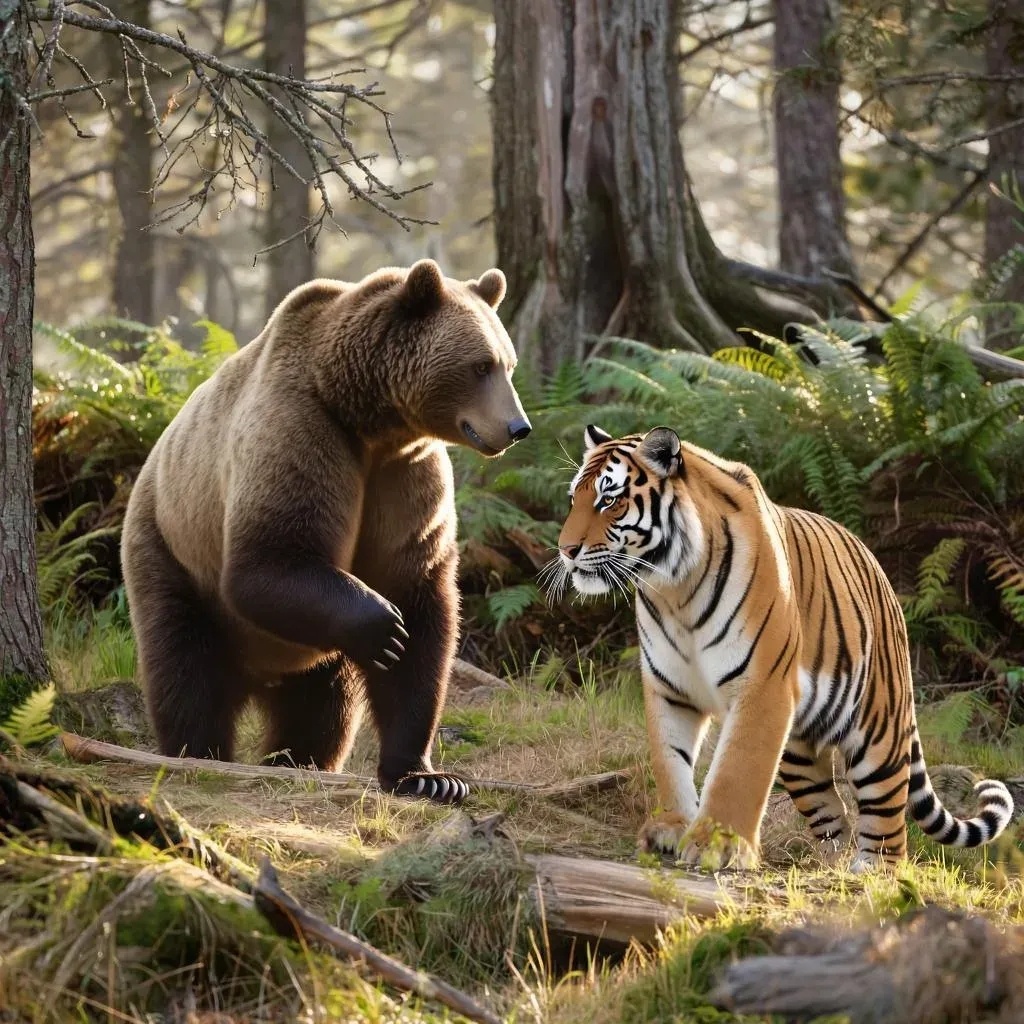 Эти два вида занимают сходные экологические ниши в дальневосточной тайге России и часто сталкиваются друг с другом на охоте. Цель данной статьи – провести сравнительный анализ физических характеристик, поведенческих особенностей и стратегий охоты обоих видов, чтобы понять, кто из них обладает преимуществом в условиях прямого столкновения. Физическое сравнение Амурские тигры достигают длины тела до 3 метров и веса около 200-350 кг, тогда как бурые медведи могут быть значительно крупнее, достигая массы от 180 до 700 кг. Медведи также обладают большей силой укуса и мощными когтями, способствующими успешной защите и нападению. Однако тигры превосходят медведей по скорости реакции и ловкости движений благодаря своей более компактной фигуре и гибкому телосложению. Основные физические характеристики: Масса: Амурский тигр: ~200–350 кг Бурый медведь: ~180–700 кг Длина тела:Амурский тигр: до 3 м Бурый медведь: до 2,4 м Амурский тигр: высокая скорость и точность удара Бурый медведь: большая с