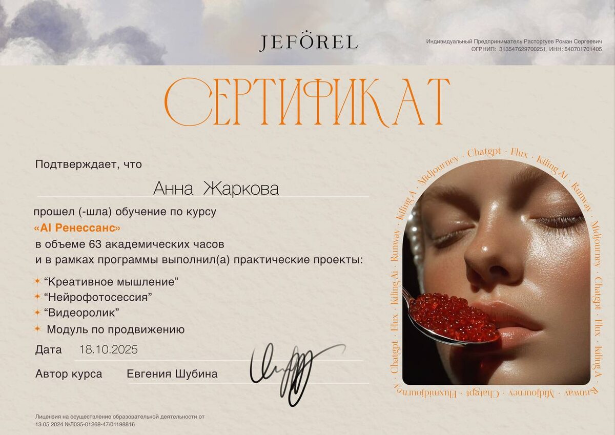 Курс Ai Renaissance - 👌 Принимаю поздравления! 🥳 Я сразу была нацелена получить максимальный сертификат. Для этого нужно было выполнить все три минипроекта. (А минимум нужно один). Честно могу сказать, что ни разу не пожалела о том, что решилась на это обучение. Знаний и вдохновения дается масса, кураторы чудесные, атмосфера среди учеников очень поддерживающая. Теперь в планах оформить портфолио, сформировать ценовую политику, и я открыта к сотрудничествам. 💛 После курса могу сказать, что я очень влюбилась в Midjourney и нейрофотосессии. Прикреплю некоторые свои работы в комментариях 📎