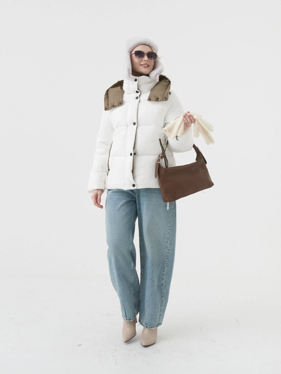 DW4185 Женская укороченная куртка в элегантном белом цвете, изящные коричневые вставки добавляют изюминку и делают куртку визуально