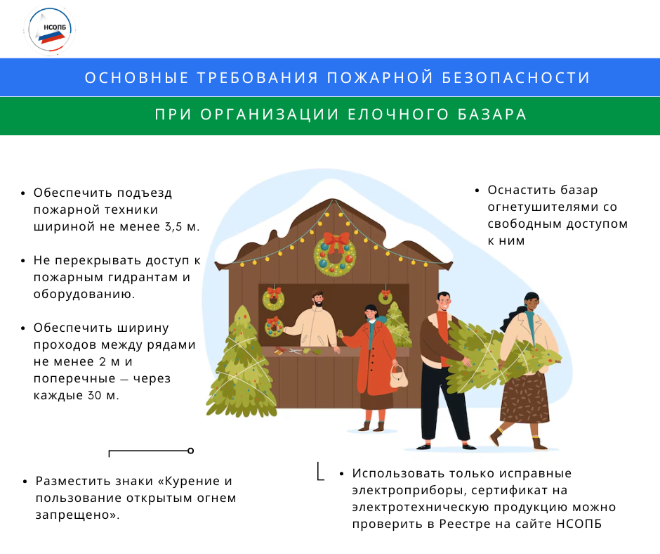 С приближением зимних месяцев по всей стране начинают работать елочные базары. Эти торговые площадки создают праздничное настроение и позволяют жителям выбрать живую красавицу к празднику. Однако важно помнить, что торговля хвойными деревьями связана с повышенной пожарной опасностью: ели и сосны — материалы, быстро воспламеняющиеся, а временные конструкции базаров часто выполнены из горючих материалов. Чтобы праздничная атмосфера не обернулась чрезвычайной ситуацией, организаторы должны строго соблюдать требования пожарной безопасности. Организация территории и проезды для пожарной техники Одним из ключевых требований является обеспечение свободного проезда для пожарных автомобилей. Согласно СП 4.13130.2013, к елочному базару должен быть обеспечен подъезд шириной не менее 3,5 метра с одной продольной стороны (пп. «б» п. 8.1, п. 8.6). Также необходимо предусмотреть проезды к ближайшим зданиям и сооружениям (п. 4.15 СП 4.13130.2013), чтобы пожарные расчеты могли беспрепятственно выполня