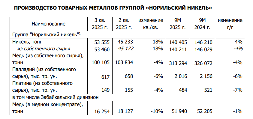 Норникель на прошлой неделе отчитался о производственных итогах за 9 мес. 2025 года. Смотрим, что под капотом - а там спад выпуска по всем ключевым металлам! Да, менеджмент обещает по итогам года уложиться в анонсированный план, но ведь и он допускает снижение производства. 📉Производство: минус год к году по всем основным позициям По итогам 9m 2025 Норникель зафиксировал снижение выпуска никеля на -4% (г/г) до 140,4 тыс. т, меди — на -4% до 313,3 тыс. т, палладия — на -6% до 2,016 млн унций и платины — на -7% до 484 тыс. унций. Даже в Забайкальском дивизионе, который отдельно раскрывается в отчётности, выпуск меди в концентрате снизился на -1%. Менеджмент объясняет просадку сменой структуры сырья (рост доли вкраплённых руд с меньшим содержанием металлов), переходом на новую горную технику и «восполнением незавершёнки». 🤦♂️Кадры: ещё один уход операционного директора — и снова перезапуск контура 17 сентября Норникель объявил о назначении Евгения Фёдорова первым вице президентом — опе