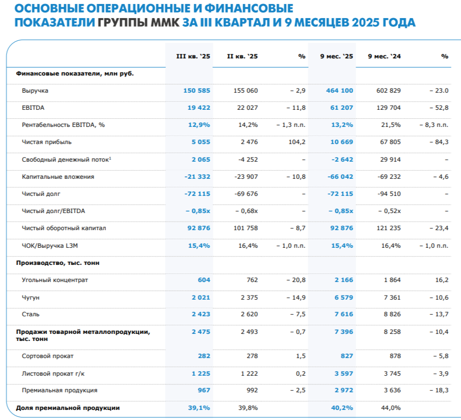 🔩 ММК представил нам финансовые результаты за III квартал 2025 г. В прошлой разборке за II кв. 2025 г. я предупреждал, что дела у компании не будут улучшаться, потому что проблемы металлургов не исчезли (цена на сталь снижается от месяца к месяцу, а высокая ключевая ставка сокращает спрос на продукцию), единственный благоприятный момент — это положительный FCF в III кв. (помог оборотный капитал), но дивидендов всё равно не стоит ожидать: