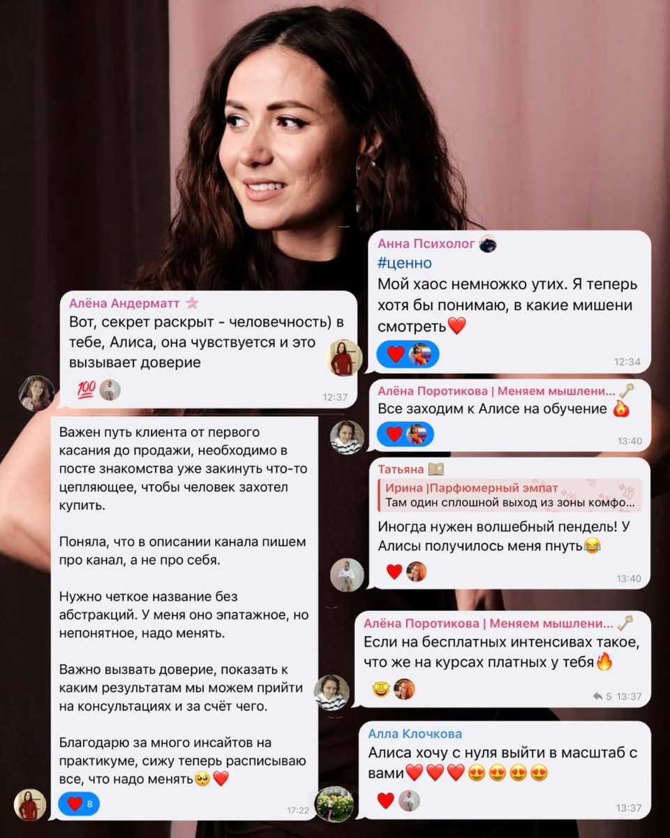 Если на бесплатных интенсивах такое, что же на курсах платных у тебя 🔥 Прошел 2-й день практикума "ИЗ ХАОСА К СИСТЕМЕ" и многие в шоке от той ценности, что я даю бесплатно. Посмотри отзывы на скринах - там еще больше крутых отзывов и инсайтов. 👆🏻 2 дня мы разбирали каждый элемент системы продвижения в Телеграм, анализировали и вот, что я увидела у 90% экспертов: 🔠Проблема со СТРАТЕГИЕЙ Хочу зарабатывать 300 тыс, для этого надо сделать 100 продаж, а у меня 50 чел на канале. Хоть замедитируйся, декомпозиция не бьется. 2️⃣Проблема с УПАКОВКОЙ и ПОЗИЦИОНИРОВАНИЕМ Из серии, помогаю решить ВСЕ проблемы во ВСЕХ сферах жизни. В итоге, клиентов нет, потому что это не работает. 3️⃣Проблема с КОНТЕНТОМ Прям на практикуме пытались написать заголовок и все мимо. Такие посты не будут открывать. А в каналах винегрет такой, что вообще непонятно, для кого пишут. 4️⃣Проблемы с ПРОДВИЖЕНИЕМ 9 из 10 участников оценили свое продвижение на 0 баллов. Это значит его нет, то есть они что-то делают, а