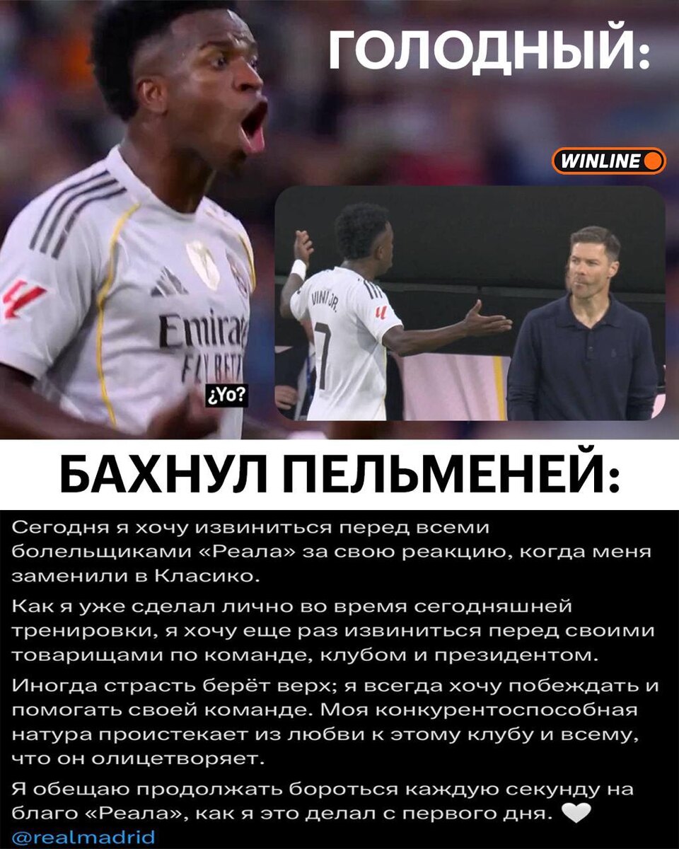 Винисиус извинился за поведение в Эль Класико 🇪🇸🇪🇸 Я хочу извиниться перед всеми болельщиками Реала за свою реакцию, когда меня заменили в Класико. Я обещаю продолжать бороться каждую секунду на благо Реала. Бразильчик был заменен на 72-й минуте, после чего он обратился к Алонсо: Меня? Тренер?! Меня?! Да пошел ты на х@й! Всегда меня! Я ухожу из команды.