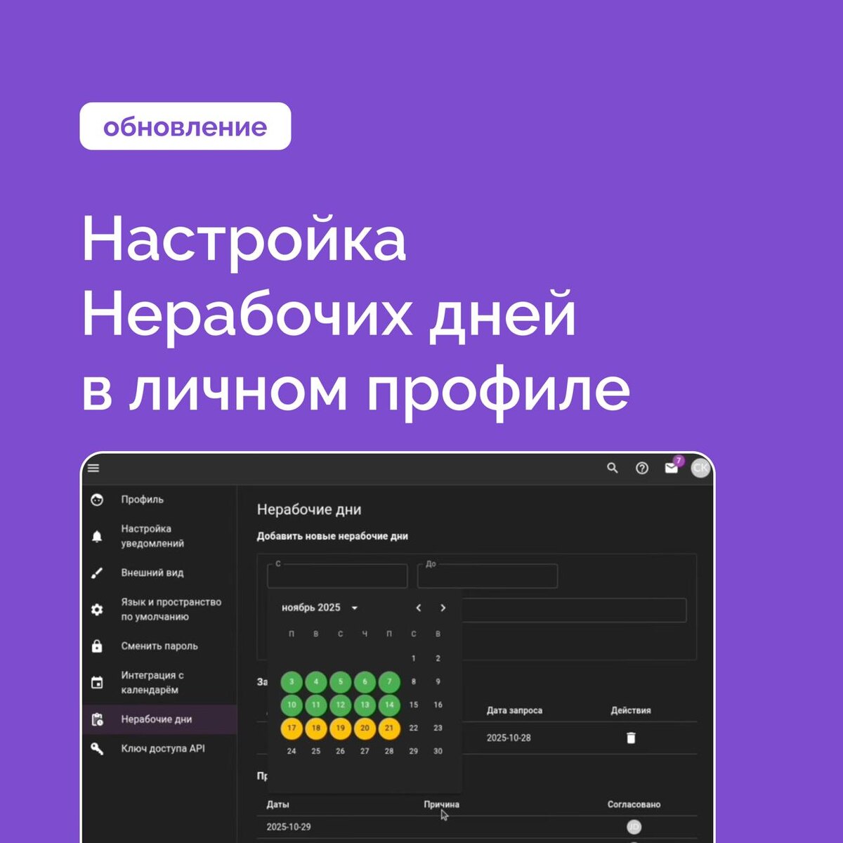 Обновление: мы доработали функциональность «Нерабочие дни» в Kaiten📆 Теперь каждый сотрудник может сам отмечать свое отсутствие — отпуск, больничный или командировку — прямо в профиле. Без лишних шагов и согласований. В компании можно настроить, нужно ли одобрять такие запросы вручную или включить автоодобрение — всё регулируется в разделе Администрирование → Настройки компании. Зайдите в Профиль → Нерабочие дни, выберите даты и укажите причину — система всё сделает сама. Функция доступна в облачной версии Kaiten; для on-premise она появится в ближайшем обновлении. Подробности и инструкцию по настройке смотрите в статье.