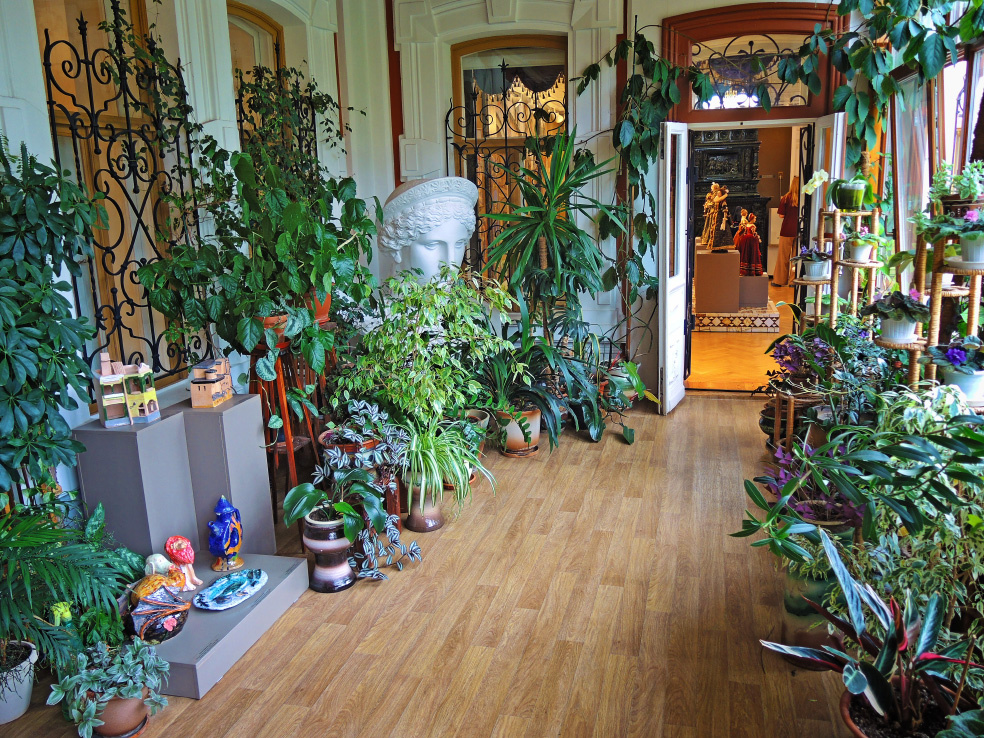 Продолжаю знакомство с экспозицией самарского музея Детская картинная галерея сезона лето-осень 2025. В этот период она традиционно состоит из двух частей. Первую - исторические куклы мастерской Ольги Бакановой - я уже показал. Предлагаю перейти ко второй. Эта часть носит название «Премьера». Она представляет работы учеников художественных мастерских, которые работают при музее. В первой части обзора приглашаю пройтись по зимнему саду. Для начала - несколько общих фото, чтобы оценить некоторые изменения, которые произошли в оформлении этой части музея. Главное, конечно, - растения, которые все остались на местах. Основное изменение - исчезла витрина с экспонатами, отражающими быт рубежа XIX-XX веков. Зато на окнах появились репродукции старых фотографий с видами двора усадьбы Клодта, где размещается музей. А вместо витрины можно (было) видеть детские работы. На стене - бумажные аппликации. Женские портреты и цветы. Под ними - керамика. К сожалению, эти изделия установлены слишком низко