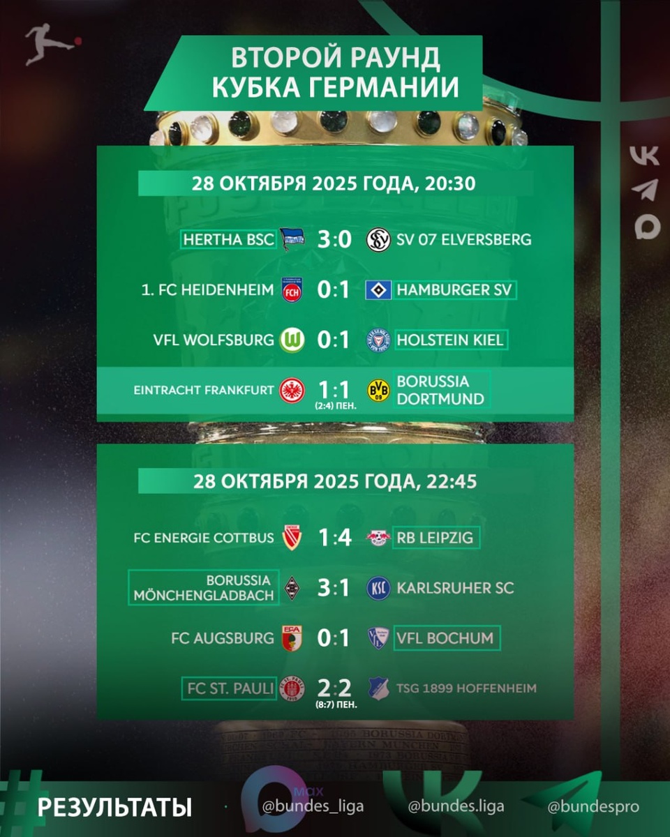 🏆 Результаты 2-го раунда Кубка Германии 🇩🇪 На данный момент ... - Клубы Бундеслиги идут дальше: 5️⃣ - Клубы низших лиг Германии идут дальше: 3️⃣ Матчи от 28.10.25 «Хайденхайм» — «Гамбург» 0:1 «Вольфсбург» — «Хольштайн Киль» 0:1 «Герта» — «Эльферсберг» 3:0 «Айнтрахт Ф» — «Боруссия Д» 1:1 (2:4 пен.) «Санкт-Паули» — «Хоффенхайм» 2:2 (8:7 пен.) «Энерги Котбус» — «РБ Лейпциг» 1:4 «Боруссия М» — «Карлсруэ» 3:1 «Аугсбург» — «Бохум» 0:1 ✓ На втором слайде - расписание матчей 29.10.25 ⭐️ MAX /// Видео+ ❤ Телеграм /// Аналитика+ ✅️ Флагманская /// Новости+