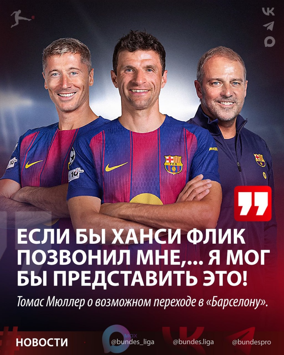 🔥 Томас Мюллер ответил на вопрос о возможном переходе в «Барселону». 💬 «Если бы Ханси Флик, который меня очень хорошо знает, позвонил мне и мне понравился бы проект «Барселоны», я мог бы представить себе что-то подобное. «Барса» — первоклассный клуб, и ты знаешь, чего от тебя ждут», — приводит слова Мюллера Barca Universal. Мюллер - воспитанник «Баварии» 🇩🇪 36-летний форвард выступает за «Ванкувер Уайткэпс» из МЛС. ⭐️ MAX /// Видео+ ❤ Телеграм /// Аналитика+ ✅️ Флагманская /// Новости+